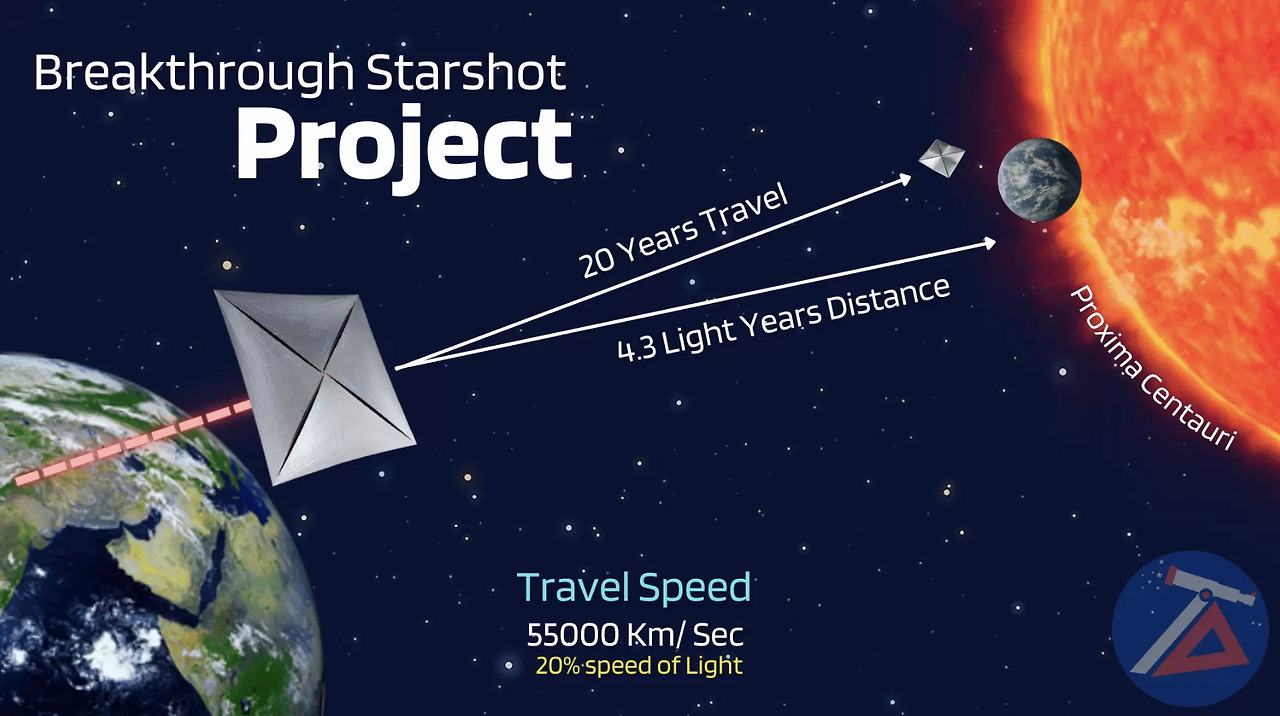 정리하자면 로켓에 스타십 1000여 대를 잔뜩 싣는다. > 대기권을 돌파해 우주에서 스타칩을 풀어놓는다. > 스타십이 돛을 핀다. > 지구의 레이저 광선이 돛을 향해 쏜다. > 저항이 없는 우주에서 우주 돛단배(스타칩) 들이 가속을 붙여 항해를 시작한다. > 계산대로라면 스타칩들은 점점 가속도가 붙어 광속의 20%까지 도달한다. (약 6만 km/s) > 20년 정도 후면 알파센타 우리에 도착한다. > 스타칩이 지구에 그쪽 행성의 데이터들을 전송한다. > 외계 생명이 있는지 우리 두 눈으로 확인한다. > 예쁜지 확인한다.