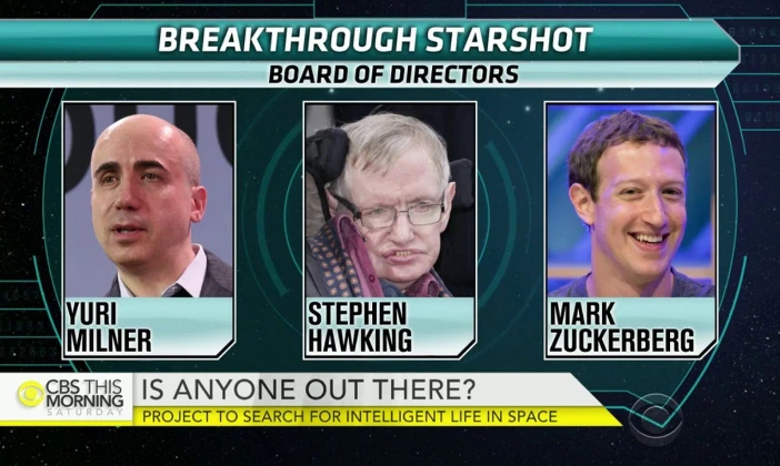코스모스의 저자이자 위대한 천문학자 중 하나인 칼세이건이 고안했고, 러시아의 억만장자 벤처사업가 유리 밀너가 후원을 했지. 그리고 21세기 최고의 천재 우주물리학자 스티븐 호킹과 페이스북 창업자 마크 주커버그가 참여했지.