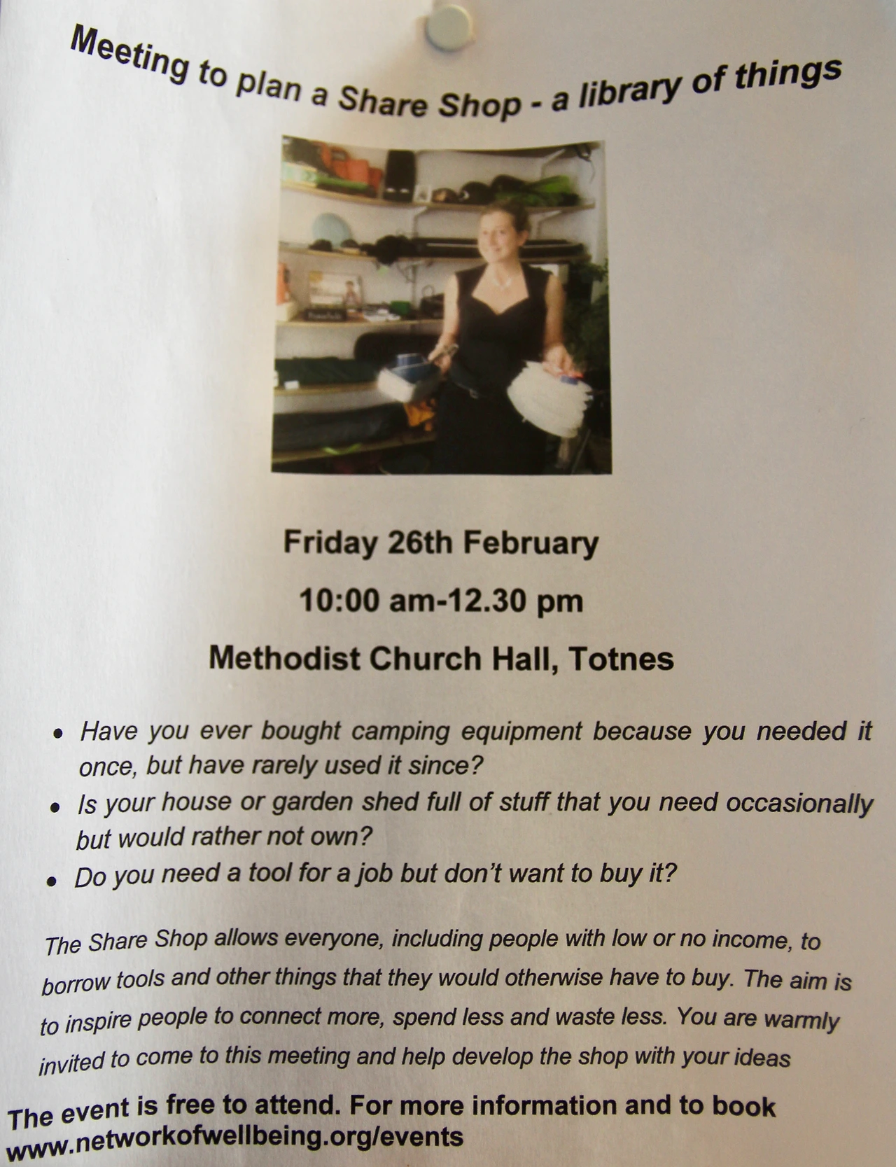 다음날 아침, 푸른 초원이 내다보이는 창가 앞 침대에서 새소리에 눈을 떴다. 다시 토트네스 시내 주변을 아침 산책 나온 듯 느릿하게 거닐다가, 도서관 앞에 세워진 게시판에서 눈길을 끄는 공지문을 보았다. 마을에서 공유창고를 만들어가는 계획을 세우기 위한 미팅에 참여해달라는 홍보 전단이었다. 이러한 문구들이 적혀 있었다.