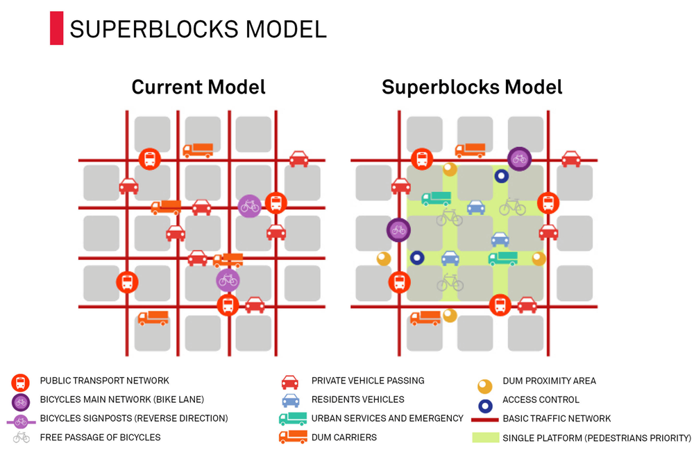 "슈퍼블록은 거주민과 보행자들이 진정으로 우선권(real priority)을 갖는 도시, 자전거, 대중교통이 개인차량에 우선하는 도시를 만들고 조직하는 모델입니다. 이런 방식으로 블록 내 거리들은 차량통행로를 넘어서는 다양한 기능을 재발견할 수 있습니다."