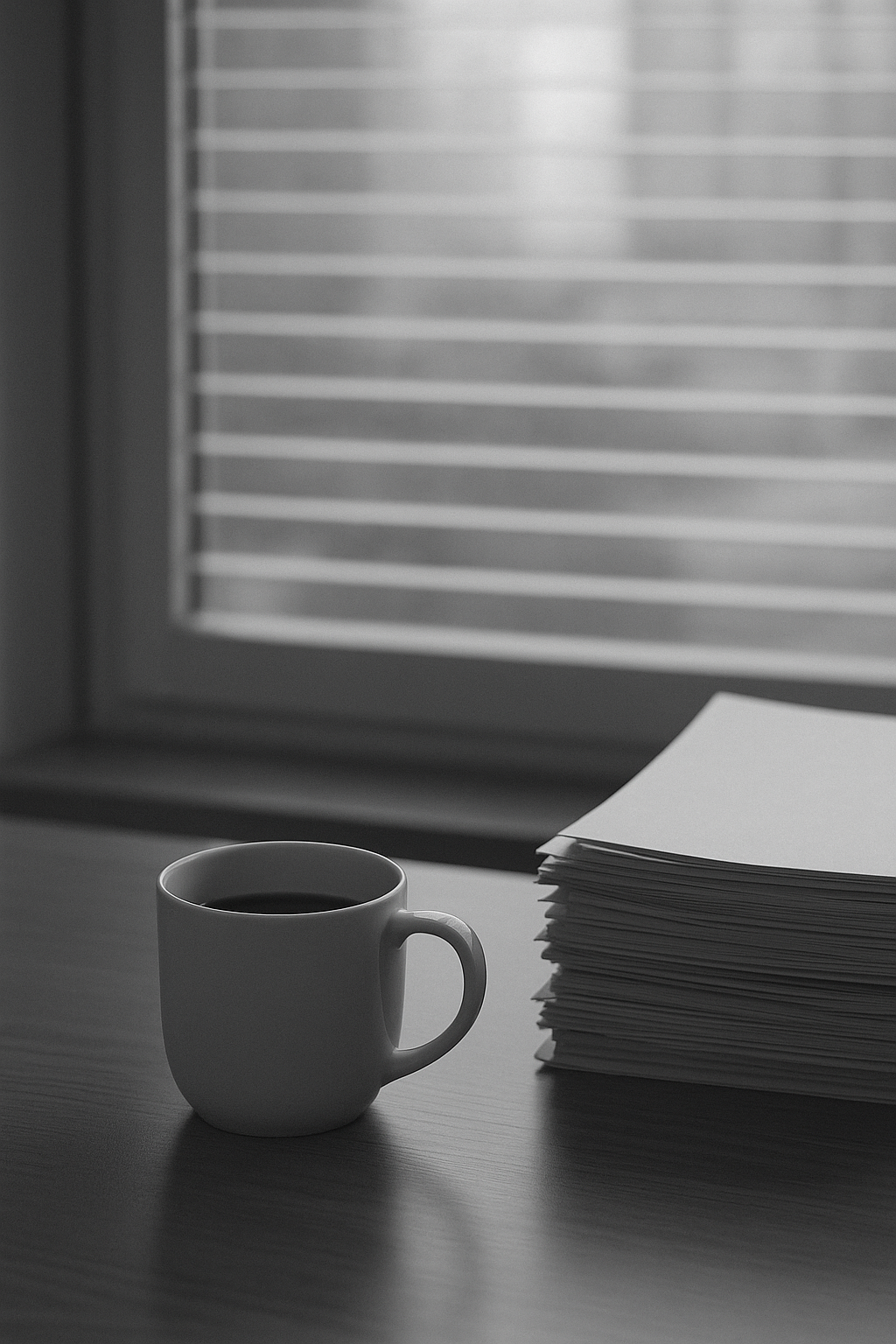 책상 위에는 아직 처리하지 못한 서류들이 쌓여 있고,