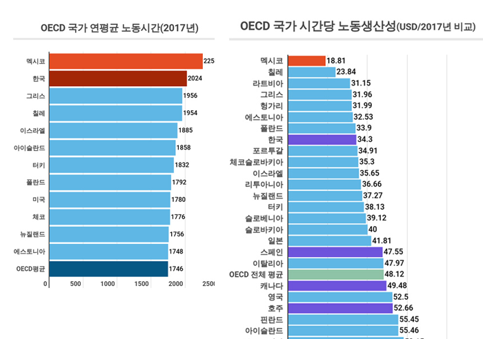 http://mn.kbs.co.kr/news/view.do?ncd=41909652017년의 한국인의 연평균 노동시간은 2024시간이었다. 1년이 8760시간이니, 한 해의 25%를 일하는 데에만 쓴다는 뜻이다. 조사를 실시한 국가들 중에서 우리보다 근무시간이 많은 나라는 멕시코 하나뿐이었다. 한편 한국인 노동 시간당 생산성은 34.3달러로 측정되었다. 36개국 중에서 29위에 해당한다. 하위권이다. 우리보다 노동 생산성이 낮은 국가는 폴란드, 에스토니아, 헝가리, 그리스, 칠레, 멕시코 등이 있다. 멕시코를 제외하면 나머지 국가는 연평균 노동시간이 2000시간을 넘지 않는다. 다시 말해 한국인은 남들보다 훨씬 많이 일하지만, 그럼에도 불구하고 훨씬 적은 가치를 생산한다. 노동의 시간이 노동의 결과물과 비례하지 않다는 것이다. 오히려 과도한 노동은 생산성에 해를 끼친다.