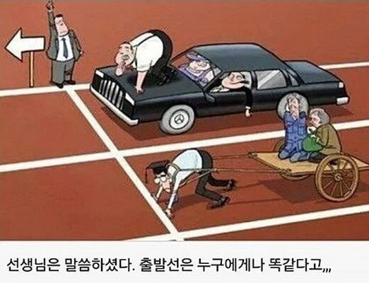 일례로 시골에서 1등하던 학생이 강남의 학교에서 시험을 보면 중위권 정도밖에 안 된다는 기사가 있다. 그렇다고 해서 시골에 살던 그 학생이 강남에서 학교를 다니는 학생들보다 공부를 덜한 것도 아니다. 나 역시 학창시절 야자는 물론 학원도 다녔다. 새벽 1~2시에 귀가하는게 일상이었다. 심지어 일요일에도 학교에 나가 공부를 했다. 나뿐만 다른 아이들도 그렇게 공부했다. 하지만 그 해 우리 학교는 서울대를 딱 1명만 보냈다. 다시 말해 아무리 많은 노력을 하더라도 분명한 한계가 있다는 것이다. 이게 만약 100M 달리기라고 친다면, 학생들의 노력은 달리기 속도를 결정한다. 학생을 둘러싼 외부의 환경들은 출발선을 결정한다. 누군가는 100M 전에서 출발하지만, 누군가는 50M 전에서 출발한다. 아무리 많은 노력을 단다고 한들, 결코 극복할 수 없는 차이가 바로 거기에 있다.