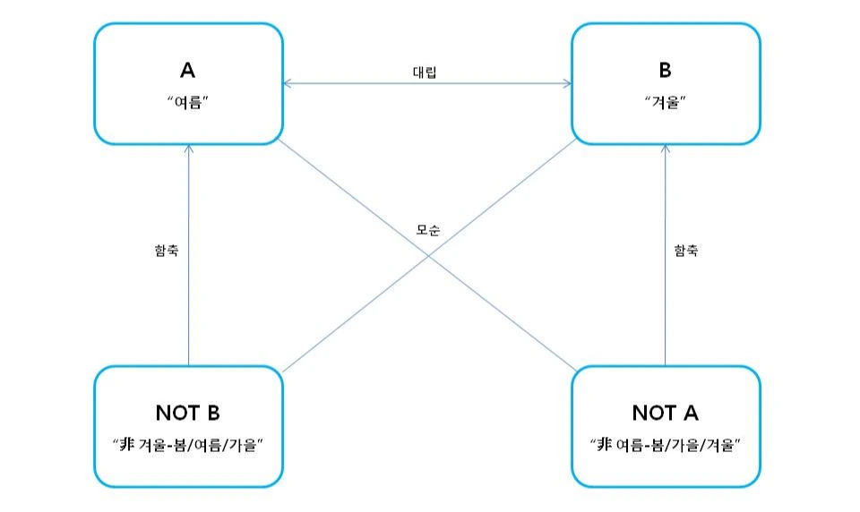 앞서 두 차례 설명했듯이 기호사각형은 그레마스가 제시한 기호학적 개념으로 이항대립과 유사한 기능을 수행한다. 다만 대립의 관계에만 매달려 이분법적 사고에 그치고 마는 이항대립과 달리, 기호사각형은 모순과 함축 관계를 포함하는 의미생성 사고의 새로운 체계를 보여준다. 다시 말해 기호사각형은 이항대립의 제한적 사고방식에서 벗어나 새로운 의미작용이 창출될 수 있도록 기호학적 영역을 제공하고, 그것을 시각적으로 배치하여 논리적이고 합리적인 설명이 가능한 효율성도 함께 제공한다.