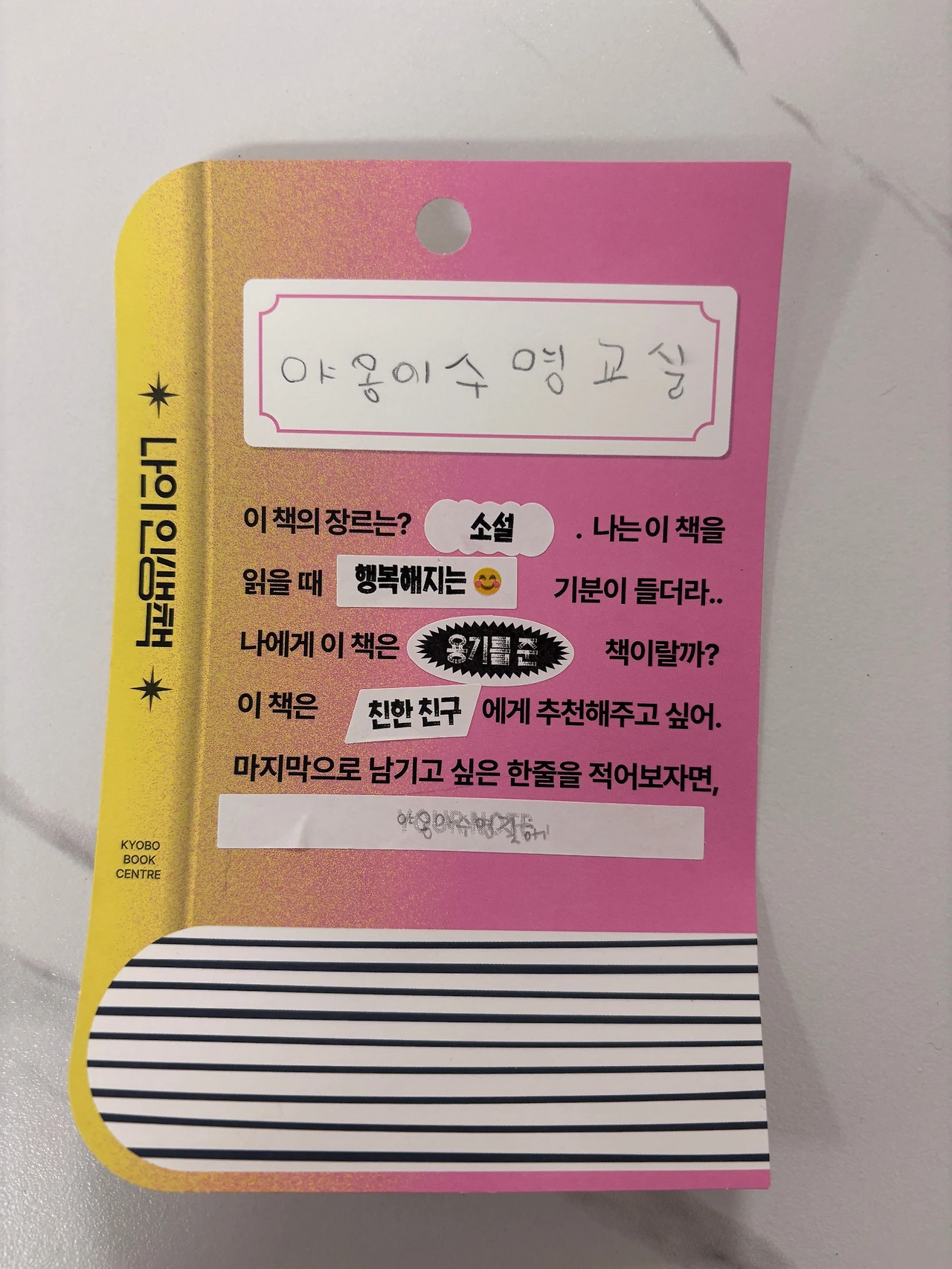 며칠 전, 언제나 그렇듯이 유치원 하원 후 엄마, 아빠 동생과 교보문고에 들린 아이는 내가 책을 결제할 동안 아빠와 한쪽 코너에서 무언가를 사부작사부작 만들고 있었다.