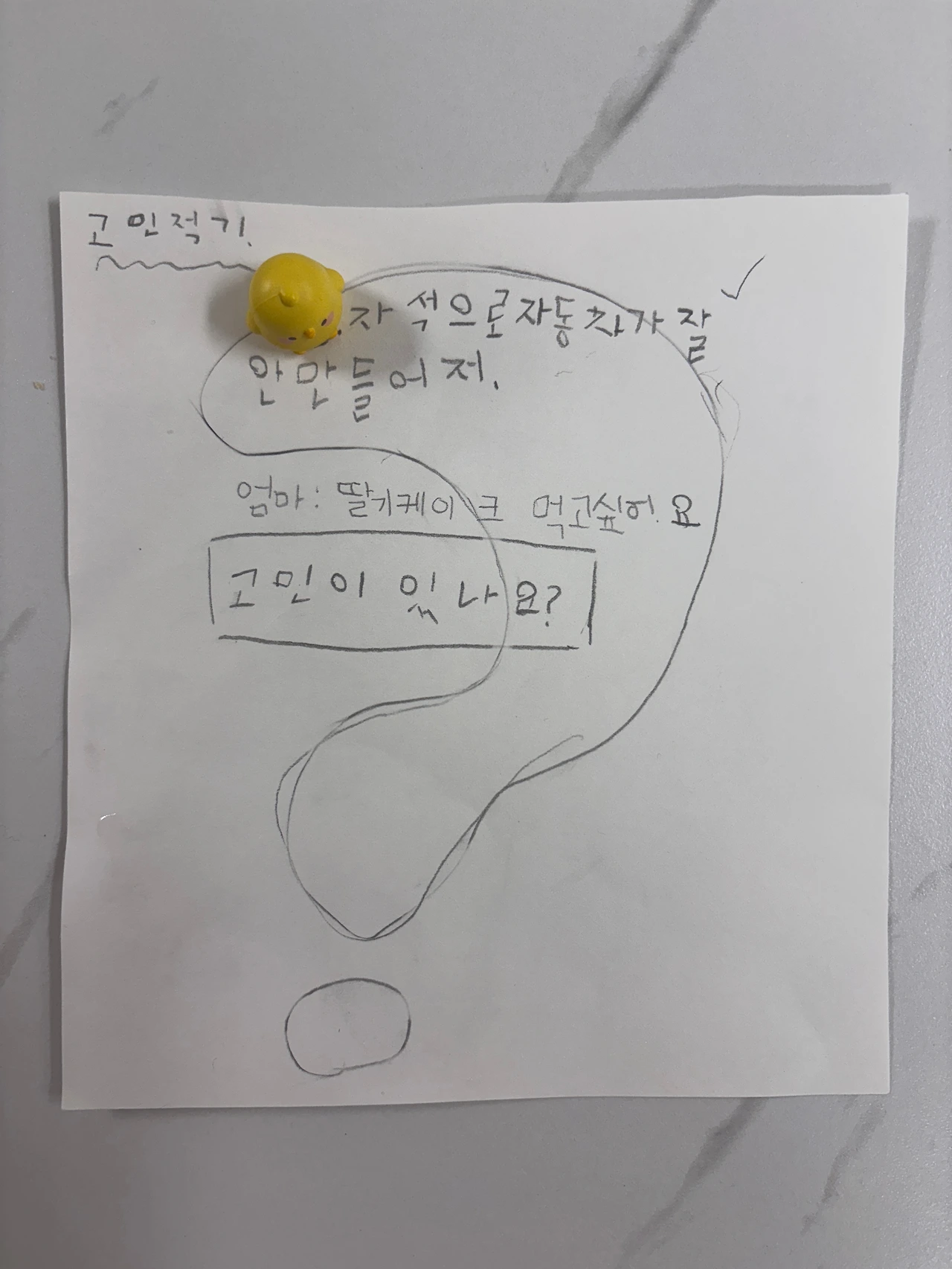 첫째 아이가 설거지를 하고 있는 나에게 불쑥 흰 종이를 내밀었다. 아이가 내민 종이에는 ‘고민이 있나요?‘라고 쓰여있었다.