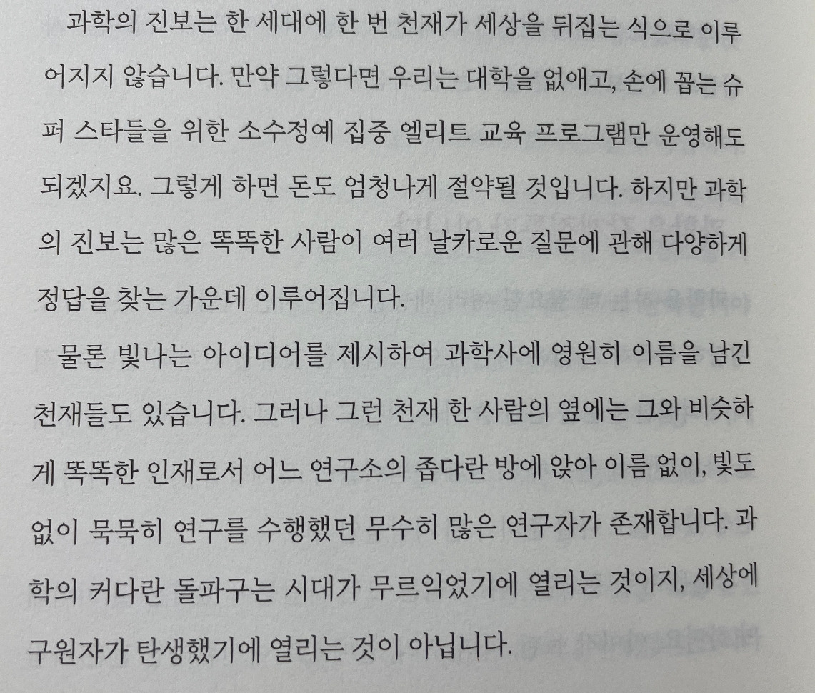 아이들이 과학에 관심을 가지게 되는 계기는 대개 ‘위대한’ 과학자들이다. 갈릴레이, 뉴턴, 아인슈타인, 과학에 관심이 없는 사람이라도 누구나 알 법한 학자들은 과학자를 꿈꾸는 수많은 이들의 롤모델이다. 내 경우도 마찬가지다. 나는 여섯 살 때 엄마 손을 잡고 간 아인슈타인 특별전에서 물리학에 완전히 매료되었다. 전시회에 다녀와서 아인슈타인을 다룬 학습만화를 찾아 읽고는 상대성이론이 뭔지 아냐며 부모님께 아는 체한 것이, 내가 기억하는 과학 꿈나무로서 나의 처음이다.