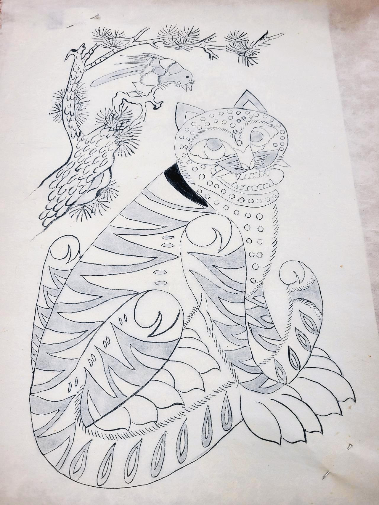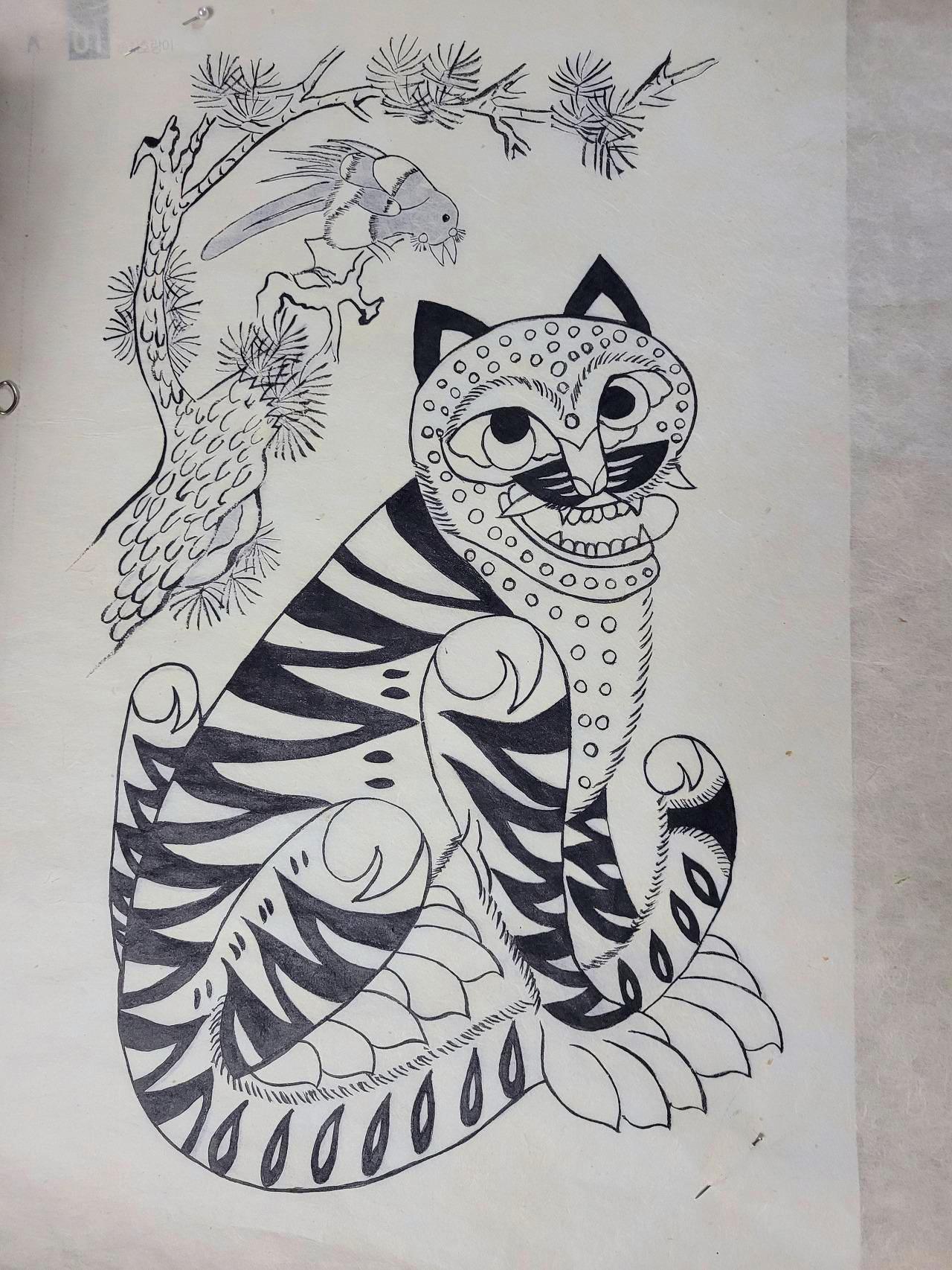 <까치와 호랑이> 느릿느릿 아줌마의 첫 민화작품^^ 이중 선생님의 붓이 거쳐간 부분은 어디일까요? ①호랑이 발 ②호랑이 귀 ③ 소나무 잎 ④까치 꼬리