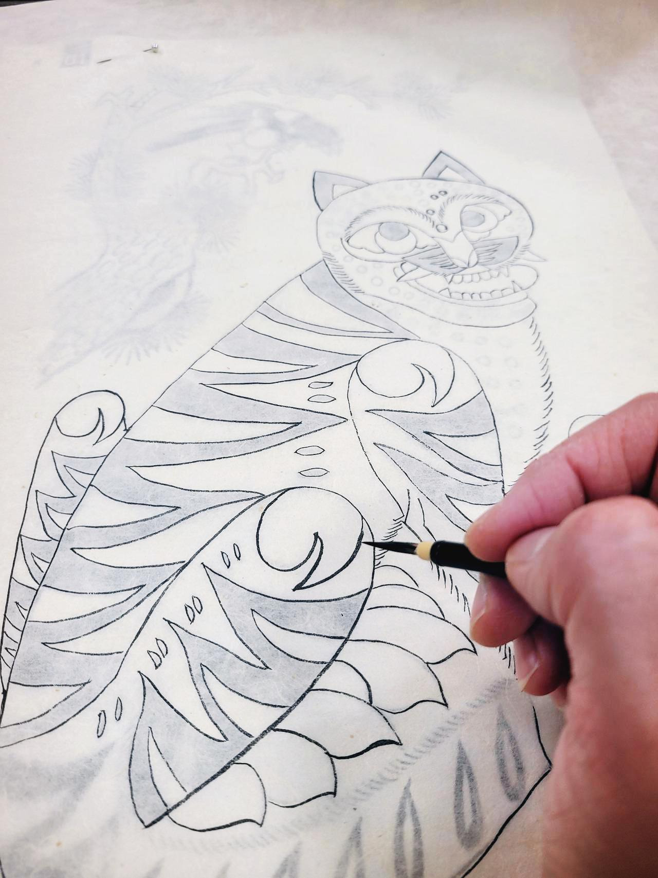 먹물로만 채색하는 과정. 호랑이의 호탕함을 표현하고 싶어 나름 붓에 힘을 실어 채색을 했는데 과연?