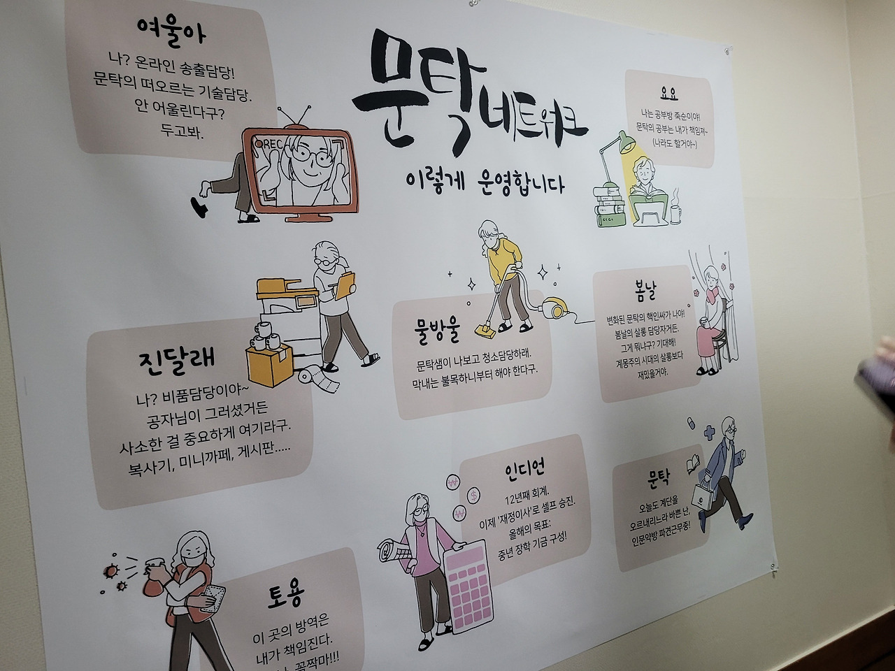 시계 방향으로 입구에 붙어있는 문탁 관계자들의 예명과 소개글> 살롱 같은 느낌의 보라방> 많은 사람을 수용할 수 있는 강의실> 개인 공부방