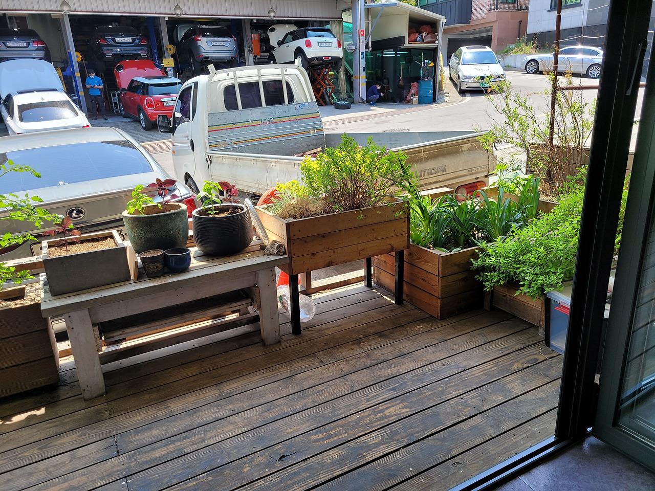 시계방향으로 파지사유 공유공간> 공유공간에서 바라본 아담한 테라스> 파지사유 전경> 자누리에서 만든 천연 화장품> 작업실> 에코랩
