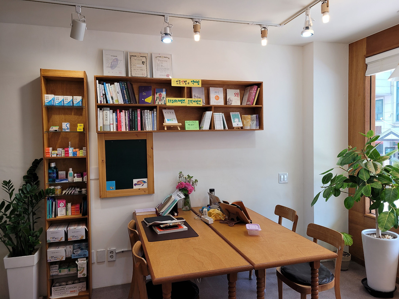 [일리치 약국]은 파지사유 옆 조그맣게 붙어있는 약국입니다. 그런데 일반적으로 약국 뒤쪽 벽을 가득 메우고 있는 약들은 보이지 않고요, 책과 쌍화탕 같은 일상적인 보약들과 영양제 몇 박스만 벽장을 채우고 있어요. [파지사유]에 들어갔을 때 한약 냄새가 나서 한약방인가 했는데 그것도 아니고 나무 질감의 인테리어에 한가운데 원목 탁자가 놓여 있는 모습이 작은 스터디 카페 같기도 합니다. 약국의 이름은 이반 일리치 신부의 이름에서 따온 것이라고 해요. 약국 대표님이신 김정선 약사께서 이반 일리치 신부의 「병이 병을 만든다」는 책을 읽고, "스스로 치유하고 자신을 돌보는 자기 배려를 가진 '호모큐라스'로 성장하게 하는 게 약사로서의 사명"이라는 깨달음을 얻고 지은 이름이라고 합니다. [일리치 약국]은 최소한의 약을 처방하고 책을 통해 마음을 치유하는 인문 약국이기도 해요. 정말 독특하지요? 왠지 이곳을 찾아오면 약 처방을 받기 전에 나의 인생 전반을 돌아보는 시간을 갖게 될 것 같습니다. 물먹은 솜처럼 마음이 무거운 사람들, 단지 말동무가 필요한 동네 어르신, 몸챙김 이전에 마음 챙김이 우선인 사람들이 이곳에 모여 도란도란 이야기도 나누고 무거운 삶의 짐도 내려놓고 그리하여 내 몸의 병과 슬기롭게 공존하는 법을 배우게 될 것 같습니다.