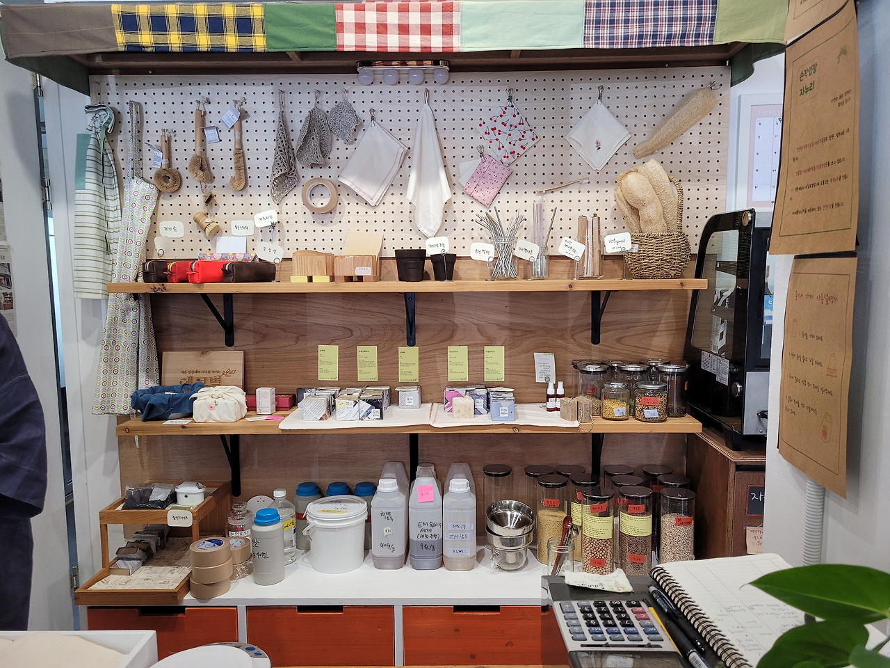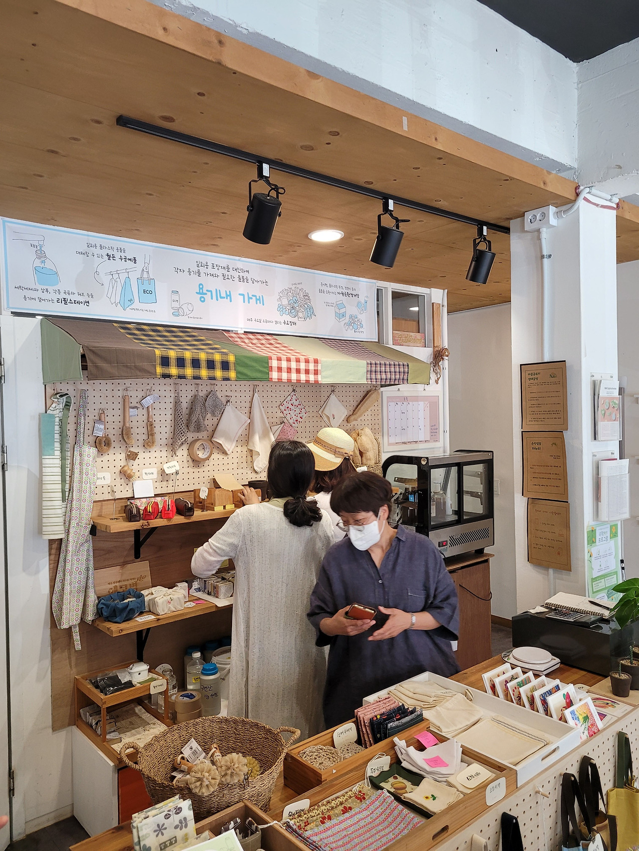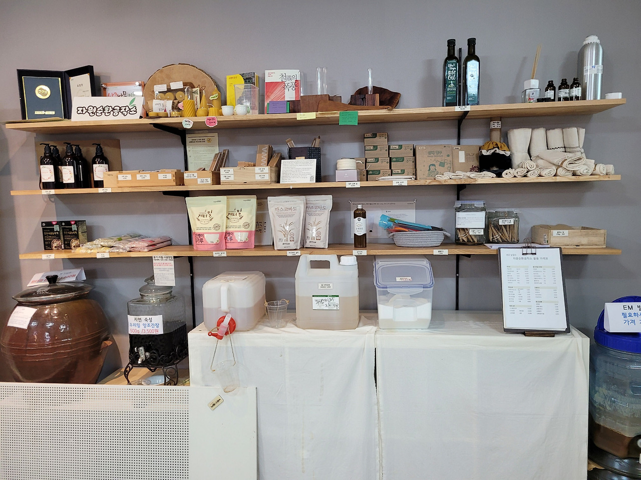 [파지사유]는 에코와 양생 실험을 하는 장소입니다. 무슨 말인가 하니 손으로 만드는 일, 자연친화적 삶의 실천을 통해서 소박하지만 절대로 허술하지 않은 심지어 예쁘기까지 한 쓰임들을 만들어내는 곳이에요. 소박하면서 예쁘고 절대 허술하지 않은 것을 만들기란, 만들어본 자들은 알겠지만 절대 간단한 일이 아니지요. 파지사유에는 일회용 포장재 대신 각자 용기를 가져와서 생활에 필요한 물품들, 예건대 주방세제, 빨랫비누, 간장, 효소를 담아가고 살 수 있는 <에코랩>을 운영하고 있어요. <에코랩>에는 손수 만든 에코백이니 행주, 수세미, 지갑, 가방, 손수건도 있구요 샴푸바, 미용비누도 판매하고 있어요. 또 <자누리>라는 모임도 있는데요, 내 화장품을 내 손으로 만든다는 모토로 생겨난 프로그램이라고 합니다. 파지사유 안쪽 방에 이끌려 들어가 보니 각종 환경 친화 유기농 화장품들의 보물창고였습니다. 파지사유에서는 현재 2022년 기획세미나로 에코 프로젝트 <천 개의 텃밭>을 운영하고 있어요. 공간 대여는 물론이고 생활과 환경을 하나로 묶어 함께 살아나갈 수 있는 지구를 가꿔나가는 일을 실천하는 공간이었습니다.