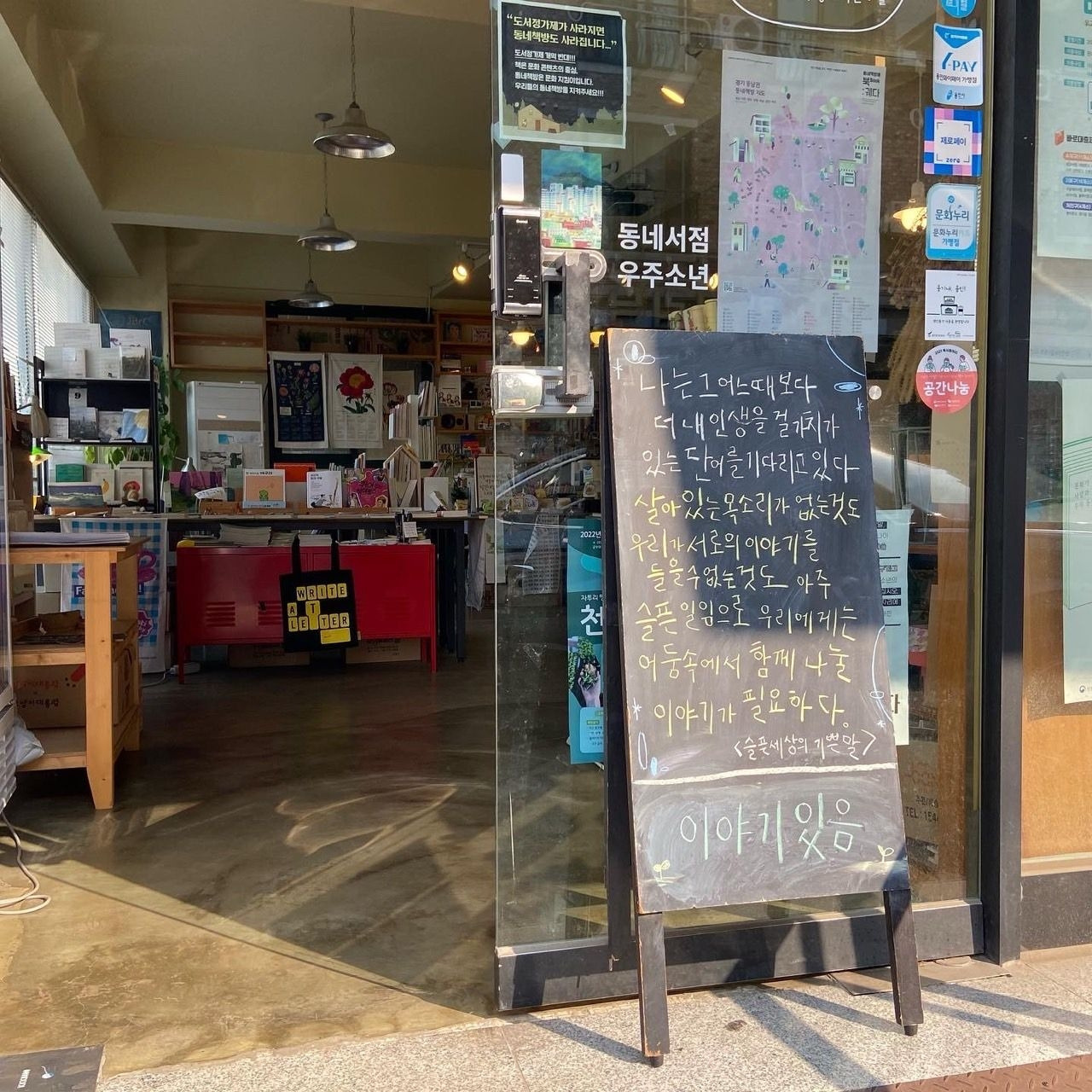 책방지기님은 학부모들의 생각과 질문에 정성껏 대답해 주셨습니다. 다행스러운 것은 [우주소년]이 인근 작은 책방과 비교해 꽤 많이 알려진 편이고 운영하는데 어려움은 있을지라도 앞으로 계속 나아가고 있다는 것이었어요. 다행이구나... 마음으로 응원하게 되었지요.
