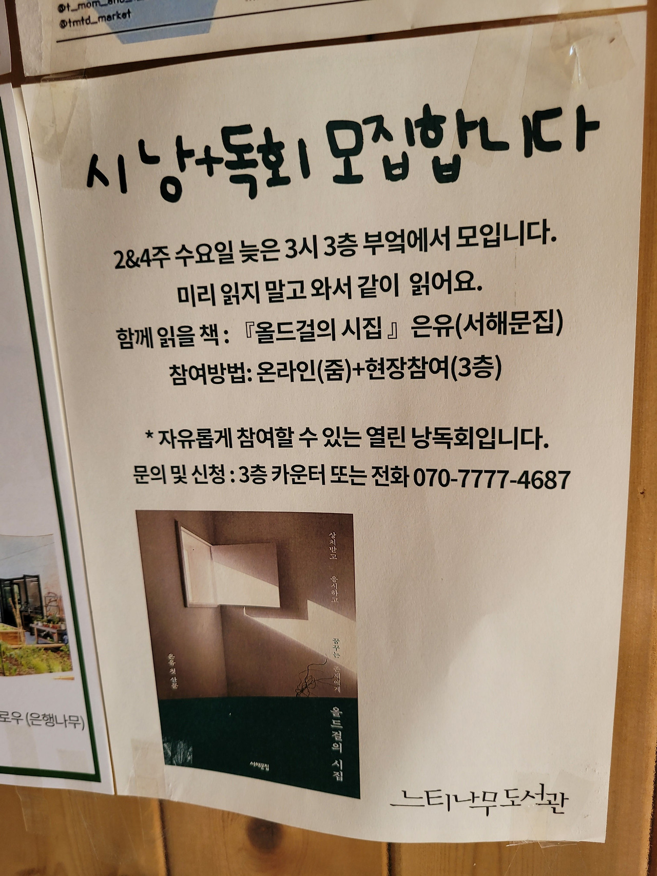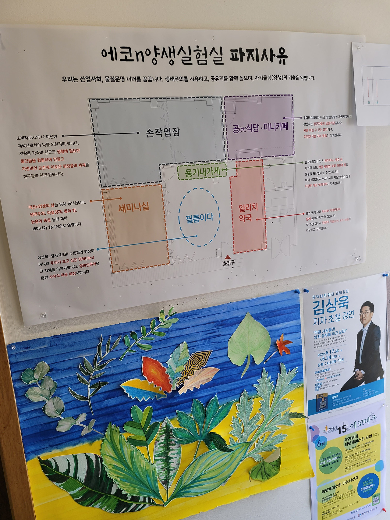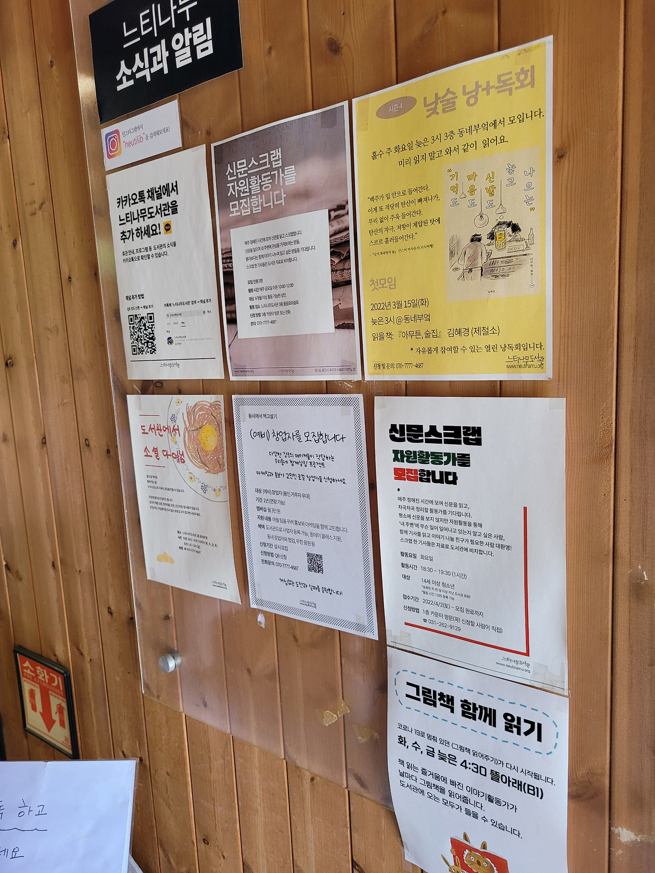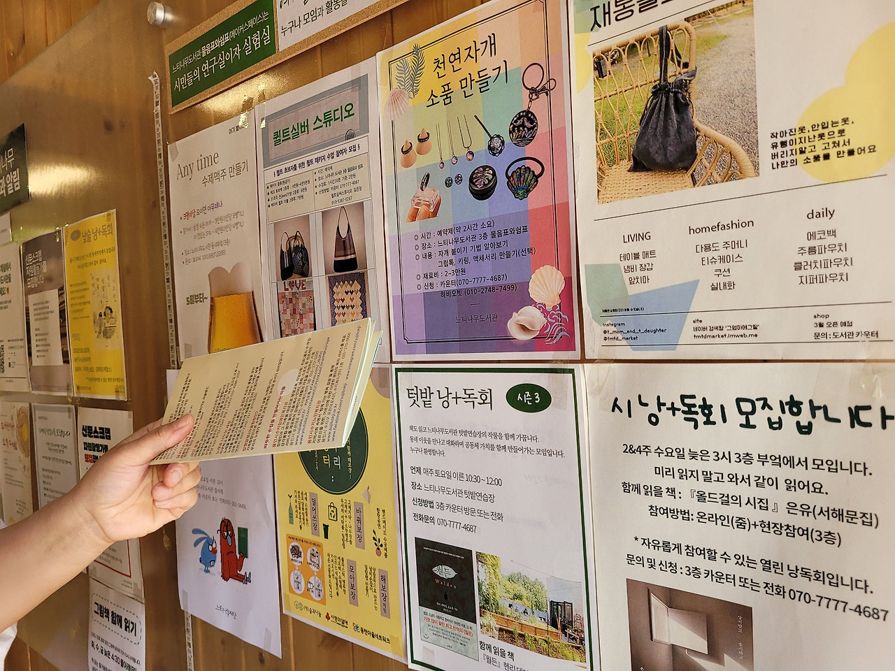 우리 탐방대가 방문한 날에 게시판에 붙어있던 모임 공고예요. 가까이만 산다면 하나씩 다 신청해보고 싶었습니다.