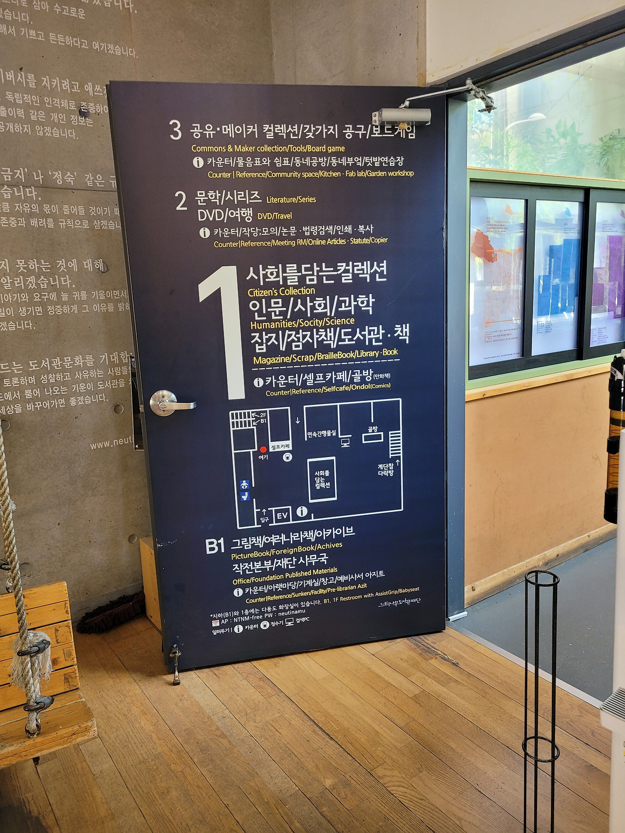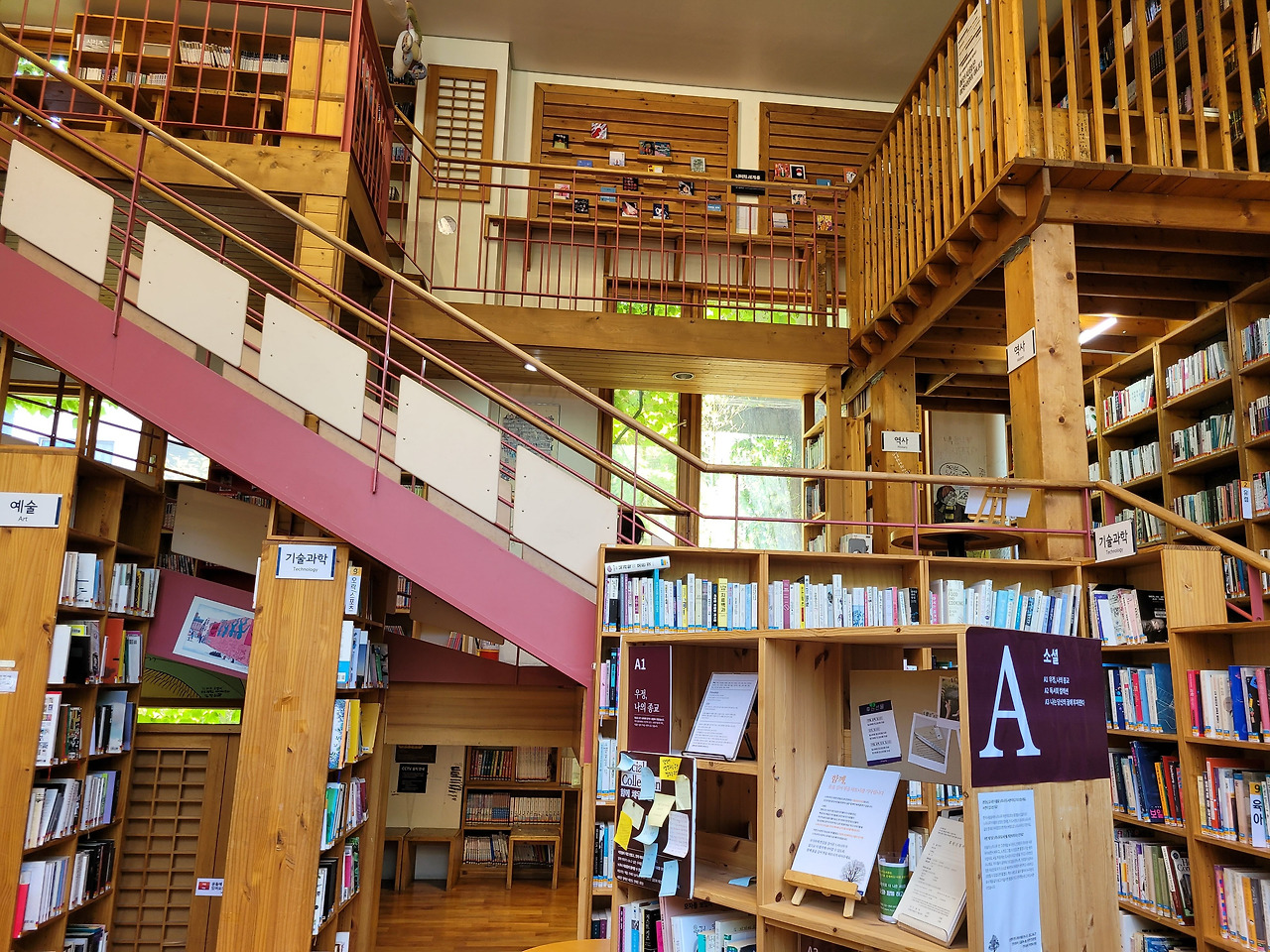 오래된 느티나무는 줄기가 아주 굵습니다. 그 굵은 줄기 밑동에 오소리가 굴을 파 살고, 여우가 더위를 피해 쉬러 오고, 참새가 둥지를 틀고, 딱정벌레가 달콤한 수액을 먹기 위해 모여들지요. [느티나무 도서관]에 들어섰을 때 딱 그런 생각이 들었습니다. 아이가 어렸을 때 읽어주었던 동화가 생각났어요. [느티나무 도서관]은 2000년에 마을 주민들의 힘으로 세운 사립도서관이라고 합니다. 무료로 이용할 수 있는 것은 물론 다양한 독서회와 모임들들이 있어 지역주민들에게 만남의 장이 될 것 같다는 생각이 들었습니다. 3층에는 공유 주방, 공유 텃밭, 공유 작업실이 자리 잡고 있고 지하 1층에는 다양한 전시와 활동이 이루어지는 공간이에요. 서고 곳곳에 아이들이 좋아할 법한 구석자리와 그네, 나무의자, 동굴 같은 공간이 있어 아이들에게는 자유롭고 어른들에겐 아늑한 공간이 되겠구나 싶었습니다.