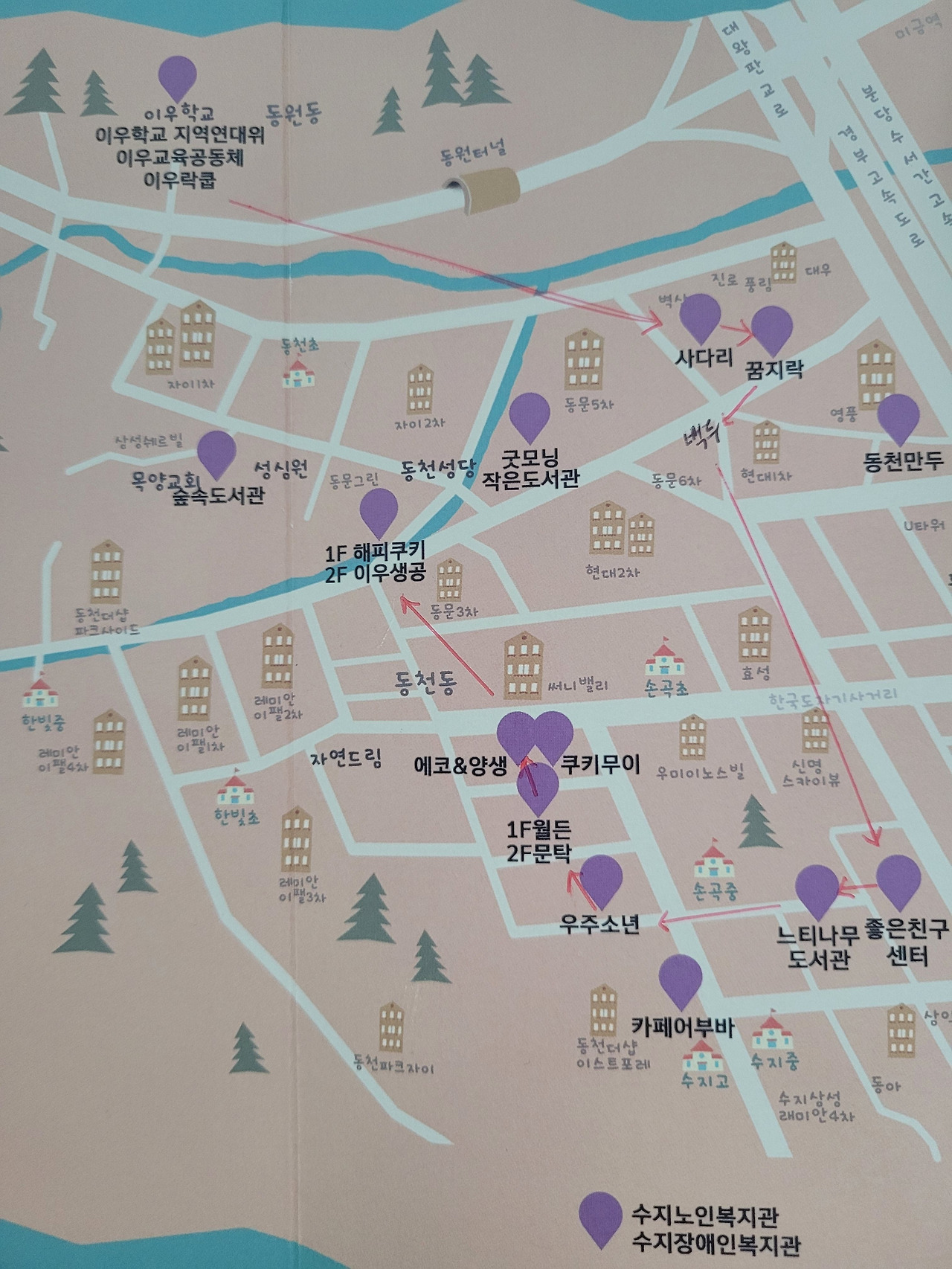 마을 탐방은 올빼미 초소에서 [동천마을네트워크] 팸플릿을 받는 것에서부터 시작됐습니다. 팸플릿에는 동천동 지도와 마을과 연계되어 활동하는 단체들에 관한 설명이 있었는데요, 해당 단체들의 온라인 주소가 함께 수록되어 있어 탐방이 끝나고 난 뒤에 궁금한 점이 있으면 찾아볼 수 있어 유용했습니다.