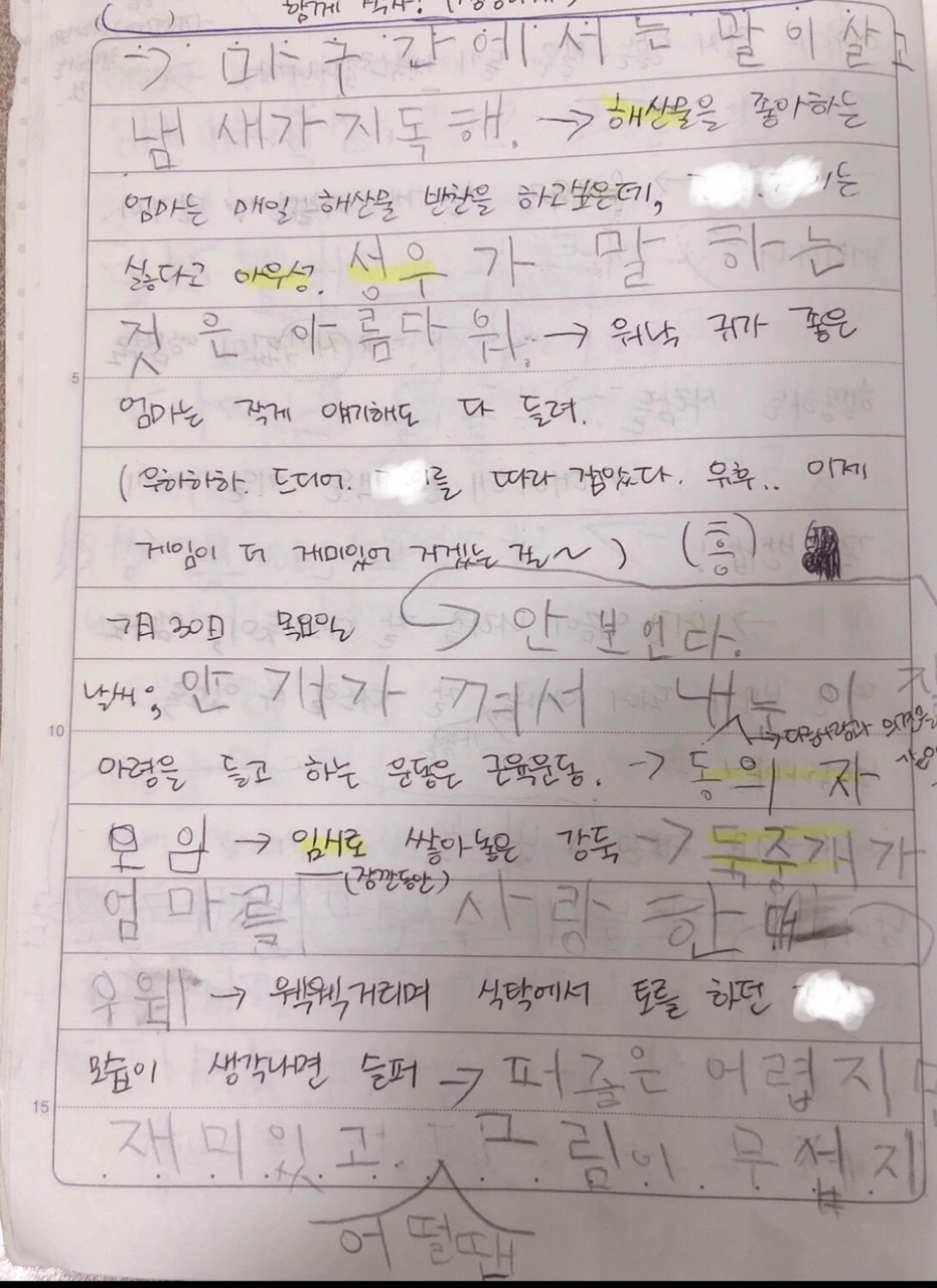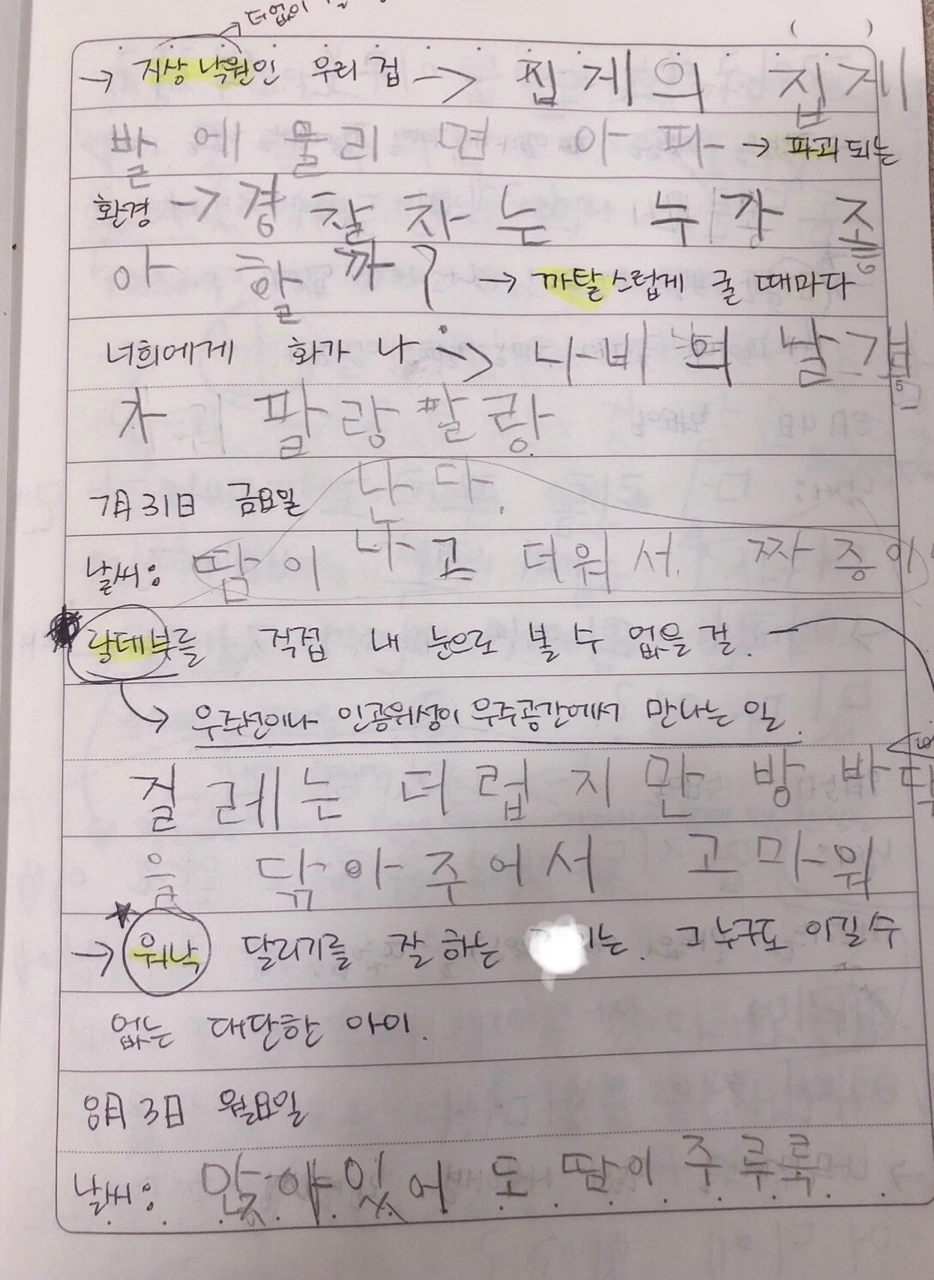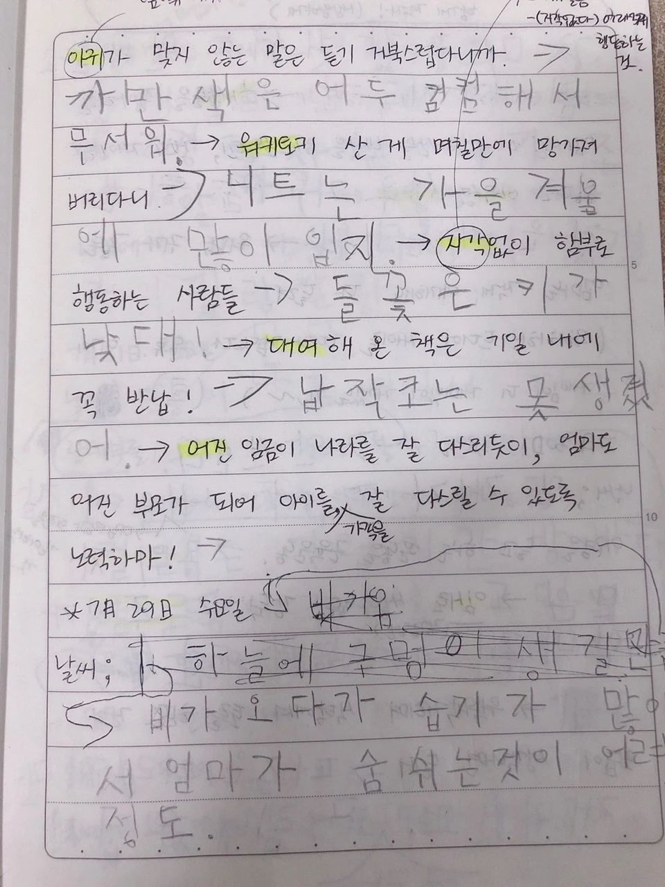 이 '끝말 문장 잇기'는 엄청난 나비효과를 일으켰는데 아이가 날 이기기 위해 국어사전을 펼쳐보기 시작한 것이다. 처음엔 내가 조금씩 노트에 설명해 주던 모르는 단어들을 본인 스스로 형광펜으로 표시해 가며 일일이 국어사전을 탐닉했다. 아이의 언어가 담긴 시간을 기록하고자 했던 욕심이 아이의 어휘를 살찌우고 있었다.
