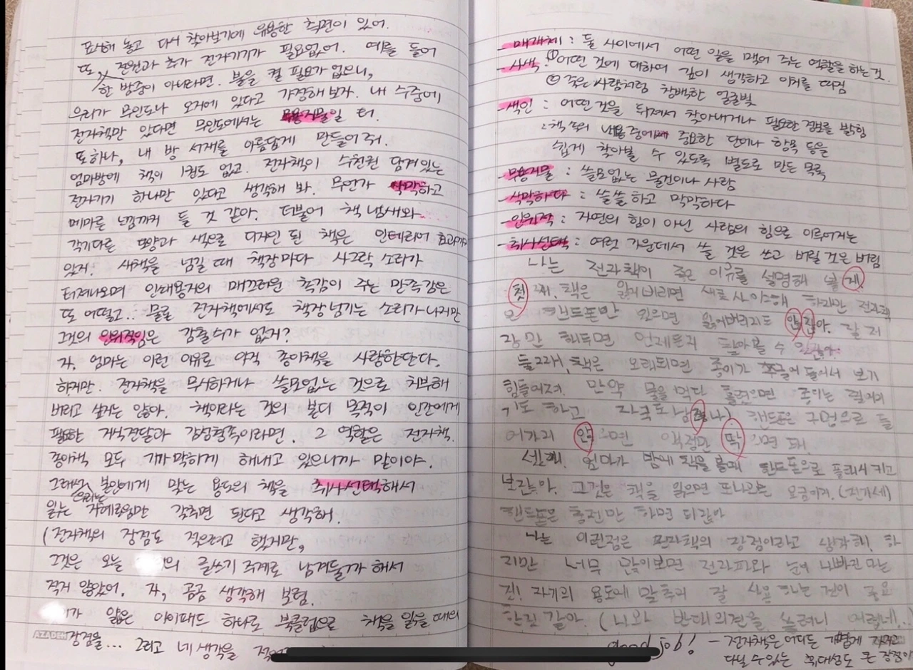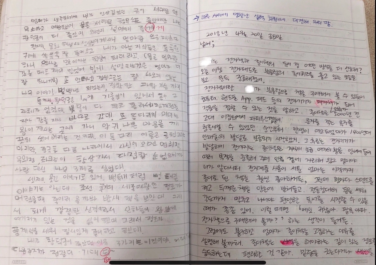 사춘기 아이는 내가 저 노트들을 읽는 걸 지금은 별로 좋아하지 않는다. 본인의 서툰 글씨와 덜 익은 생각들이 낱낱이 담겨 있으니 부끄러운 모양이다. 그래서 꼭 몰래 읽는다.