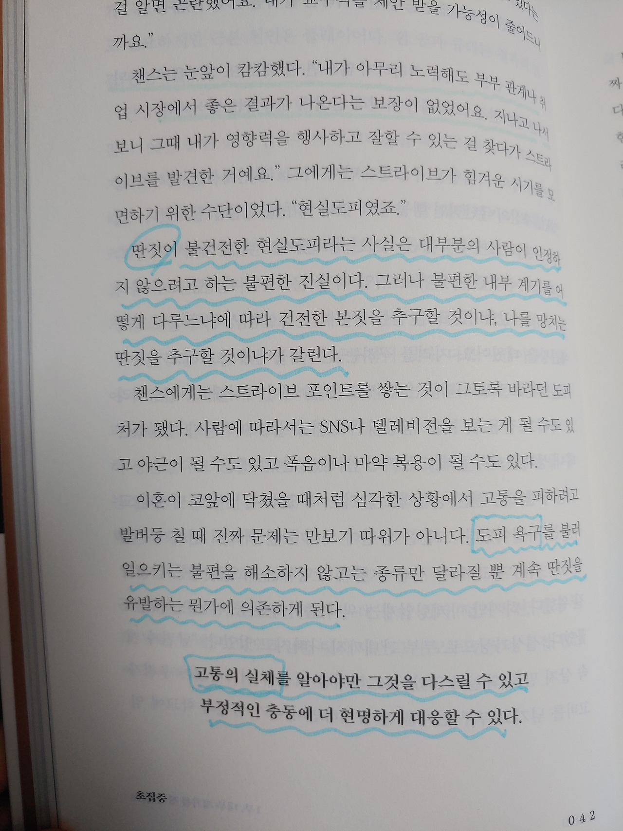 도피 욕구를 불러 일으키는 불편을 해소하지 않고는 종류만 달라질 뿐 계속 딴짓을 유발하는 뭔가에 의존하게 된다. 고통의 실체를 알아야만 그것을 다스릴 수 있고 부정적인 충동에 더 현명하게 대응할 수 있다. (p 42)