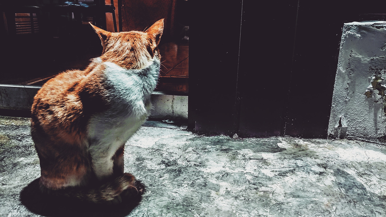 길냥이 한마리가 술집 문 앞에서 손님과 주인에게 애교를 부리며 차분히 잔반을 기다리고 있는 모습이 눈에 띄어 한 컷을 찍었다.