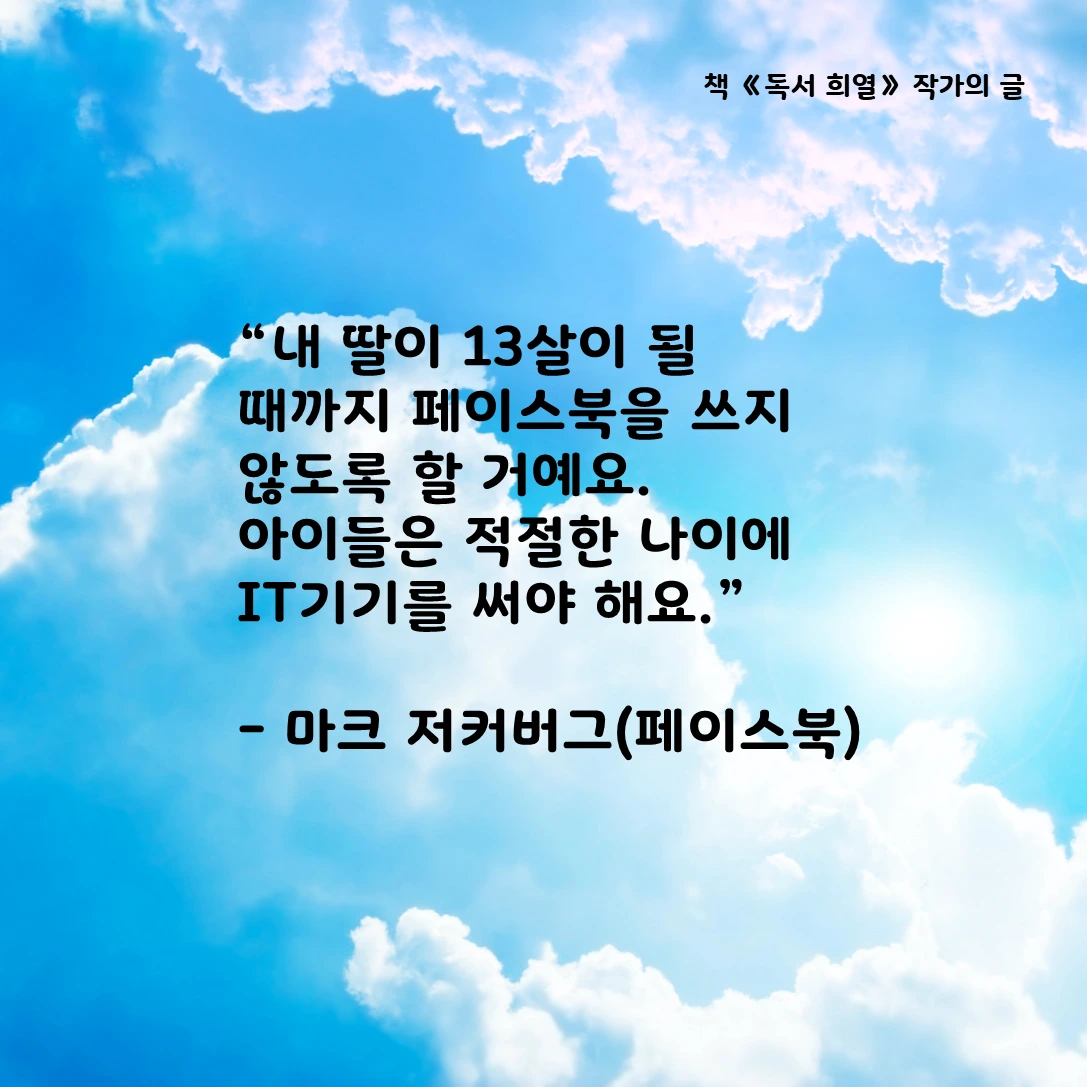 저는 아이들이 '적절한' 나이에 IT기기를 써야 한다고 봐요. 제 딸이 13살이 될 때까지 페이스북을 접하지 않게 할 겁니다.