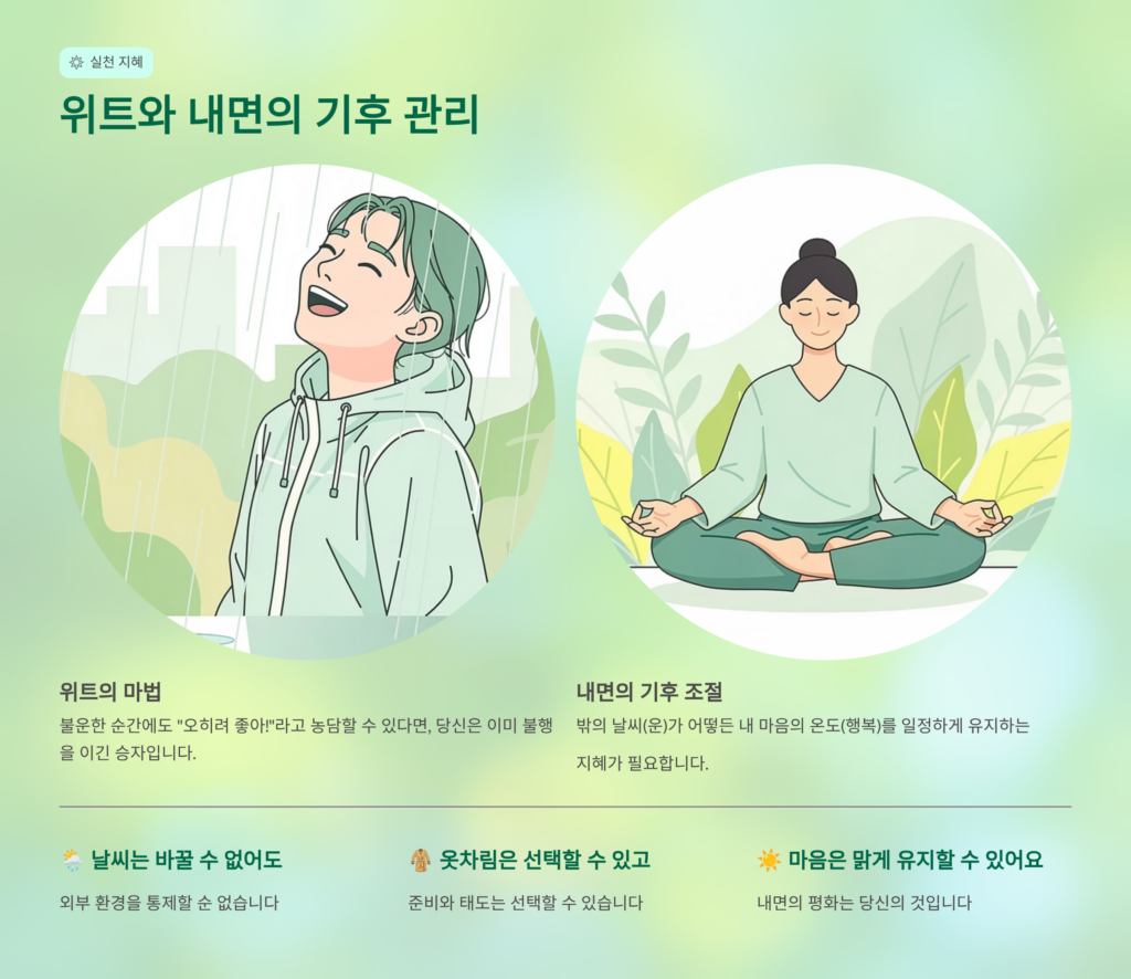 결국 우리 인생의 날씨는 외부에서 결정되는 행운과 불운이 아니라, 내 안의 기상청인 '마음'이 어떻게 예보하느냐에 달려 있습니다. 밖에는 천둥 번개가 쳐도 내 마음의 실내 온도를 따뜻하게 유지한다면 그것은 불행이 아니라 하나의 역동적인 풍경일 뿐입니다. 행운을 쫓아다니며 일기예보에 일희일비하기보다, 어떤 날씨에도 상관없이 행복할 수 있는 나만의 '내면 기후'를 만드는 것이 철학의 핵심입니다. 오늘 하루 나에게 찾아온 작은 행운에는 감사하되 그것에 인생을 걸지 말고, 예상치 못한 불운에는 "오, 이런 변수가?"라며 윙크해 줄 수 있는 여유를 가져보세요. 행복은 거창한 목적지가 아니라 지금 이 순간 불운과 행운 사이에서 내가 선택하는 '기분'의 조각들입니다. 매일 아침 거울을 보며 "오늘도 내 행복은 내가 요리한다!"라고 다짐하는 여러분이 되기를 응원합니다.