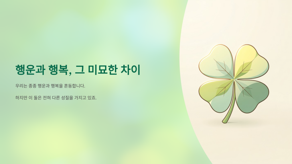 행운(Luck)은 우리가 통제할 수 없는 외부의 우연한 사건으로, 마치 길을 걷다 우연히 마주친 연예인처럼 예고 없이 찾아옵니다. 반면 행복(Happiness)은 내가 어떤 마음가짐으로 일상을 대하느냐에 따라 결정되는 지속적인 심리적 상태를 의미합니다. 행운은 우리를 잠깐 웃게 만들지만, 매일의 삶을 든든하게 채워주는 것은 행운이라는 간식이 아니라 행복이라는 따뜻한 집밥입니다. 행운에만 집착하는 사람은 복권 당첨번호를 기다리듯 늘 불안한 삶을 살게 되지만, 행복을 아는 사람은 오늘 마신 우유 한 잔에서도 기쁨을 찾아냅니다. 철학적으로 볼 때 행운은 '사건'이고 행복은 '태도'라는 점을 명확히 구분해야 우리 삶의 중심을 잡을 수 있습니다. 보너스인 행운이 오지 않는다고 해서 내 인생의 주식인 행복까지 굶을 필요는 전혀 없다는 사실을 기억해야 합니다.