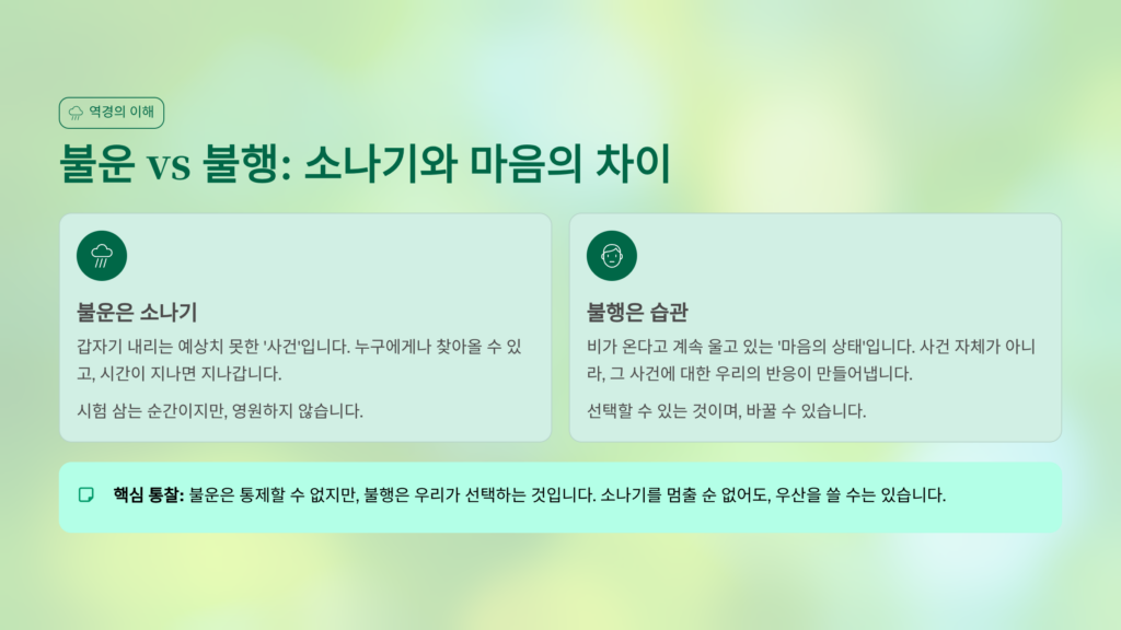 살다 보면 시험 문제를 잘못 읽거나, 새 신발을 신고 나갔는데 껌을 밟는 것 같은 불운(Bad Luck)을 피할 수 없습니다. 하지만 이러한 불운한 '사건'이 곧바로 내 인생의 불행(Unhappiness)으로 이어지는 것은 아니며, 불운은 잠시 지나가는 소나기일 뿐입니다. 비에 젖었다고 해서 내 인생 전체가 물바다가 된 것처럼 절망하며 스스로를 괴롭히는 습관이 바로 우리를 진짜 불행하게 만드는 원인입니다. 불행은 특정한 사건 때문이라기보다 그 사건을 바라보는 부정적인 시각이 굳어져 만들어진 마음의 '긴 겨울'과 같은 상태입니다. 소나기가 오면 우산을 쓰거나 잠시 비를 피하면 되듯이, 불운한 일이 생겼을 때 "아, 재수 없네!" 하고 툭 털어버리는 위트가 필요합니다. 사건은 밖에서 일어나지만, 그 사건을 불행이라는 감옥으로 가져와 가두는 것은 결국 자기 자신이라는 점을 깨닫는 것이 중요합니다.