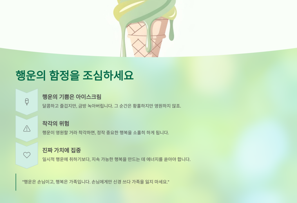 행운과 불운은 우리가 선택할 수 없는 손님과 같지만, 행복과 불행은 그 손님을 대하는 주인의 태도입니다. 무례한 손님(불운)이 왔다고 해서 집안 전체를 난장판(불행)으로 만들 이유는 없습니다. 좋은 손님(행운)에게는 감사하되, 손님이 떠난 후에도 여전히 평화로운 집(행복)을 가꾸는 것, 그것이 우리가 배워야 할 인생의 가장 아름다운 기술입니다.