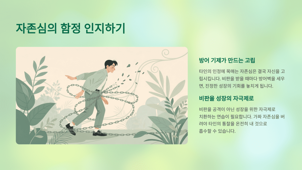 자존심은 타인에게 비치는 나의 이미지를 지키기 위해 뇌가 에너지를 소모하는 방식입니다. 이는 외부의 비판이나 새로운 정보를 공격으로 인식하게 만들어, 결과적으로 자신이 틀렸음을 인정하지 못하게 방해합니다. 남에게 무시당하지 않으려는 에너지를 자신의 실력을 객관적으로 증명하는 데 전환할 때 비로소 진정한 발전이 시작됩니다. 자존심을 내려놓는 것은 패배가 아니라, 더 큰 세상을 받아들일 수 있는 그릇을 키우는 행위입니다.