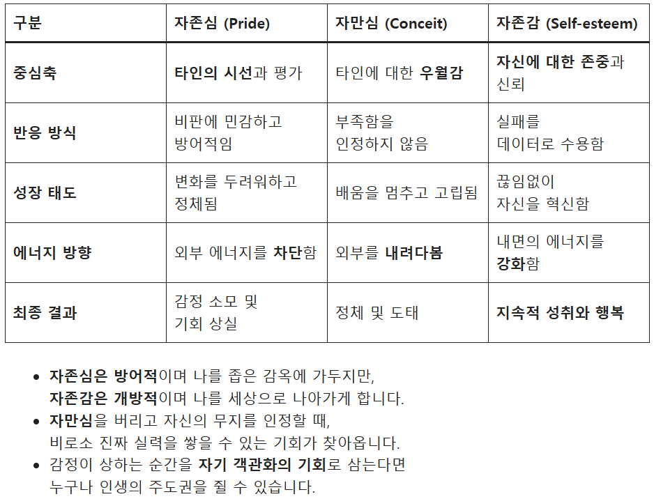 인생의 성공 궤도에 오르기 위해 가장 먼저 선행되어야 할 작업은 자아를 알고 내면의 알고리즘을 분석하는 것입니다. 우리가 흔히 혼동하는 자존심, 자만심, 자존감의 차이를 이해하는 것만으로도 삶의 질은 획기적으로 변화합니다.