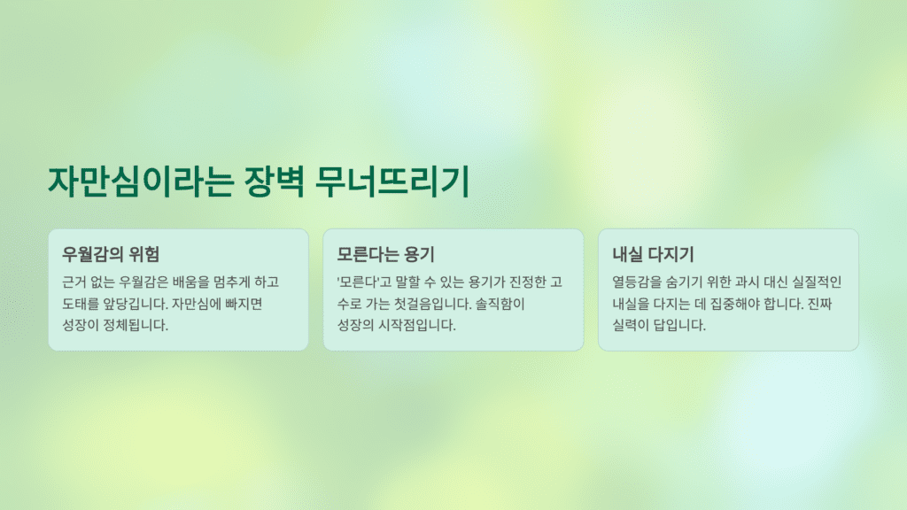 자만심은 자신의 실제 능력보다 스스로를 과대평가하며 타인을 아래로 내려다보는 심리적 상태를 말합니다. 이는 대개 내면의 깊은 열등감을 감추기 위한 과잉 보상 기제로 나타나며, ‘나는 이미 다 알고 있다’는 오만한 착각을 불러일으켜 학습의 기회를 스스로 차단합니다. 진정으로 단단한 사람은 자신의 무지를 인정하는 데 주저함이 없으며, 자만심이라는 허상을 버릴 때 비로소 새로운 지식과 기회가 들어올 공간이 생겨납니다.
