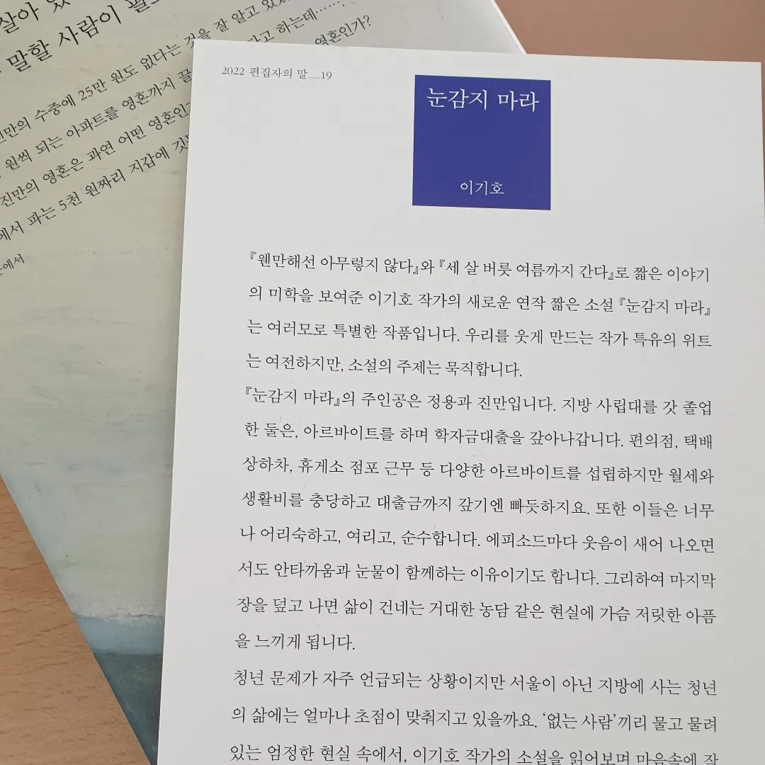 처음 읽기 시작할 때만 해도 [눈감지 마라]는 제목이 이렇게 가슴 아프게 남을 줄은 몰랐다. 대여섯 쪽의 짧은 내용 안에 인물과, 상황과 사건이 다 갖춰져 있는 것도 놀라운데 씁쓸한 유머와 짙은 페이소스까지 다 담겨 있다. 최근에 읽으면서 이렇게 깊이 가슴 아프고 깊게 공감하며 읽은 소설이 있었던가 싶다. 지금 당장의 기후위기와 환경문제보다, 나와 같은 여성의 생존권 문제 보다 왜 이 청춘의 이야기가 이렇게 가슴 저리는 걸까? 잠시 생각해보다 깨달았다. 그래, 이게 소설이 지닌 힘인가 보다.