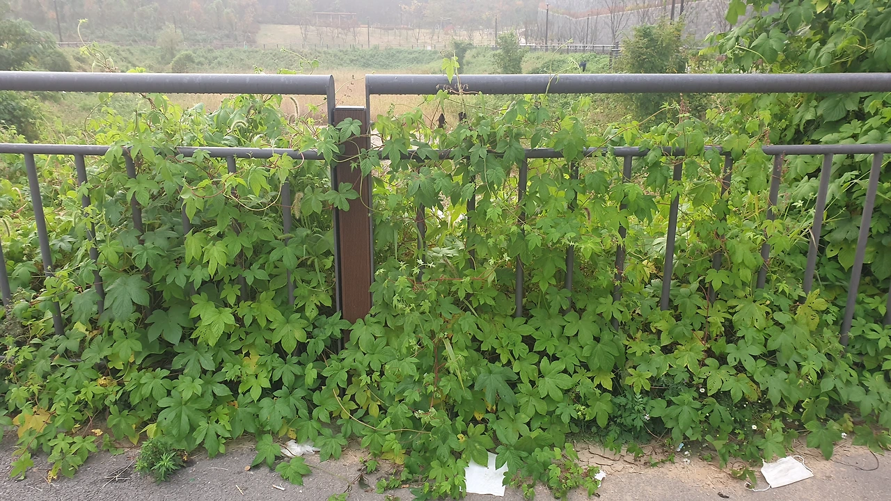 옆으로 난 산책길을 따라 걸었다. 겨울까지 버티려는지 무성하게 자란 들풀들이 보도까지 뻗어나와있다. 어디든 닿기만 하면 칭칭 감아올리겠다는 듯 넝굴줄기가 길가로 뻗어나오고, 아직까지 초록빛이 선명한 잎들이 펜스를 삼킬듯이 넘실댄다.