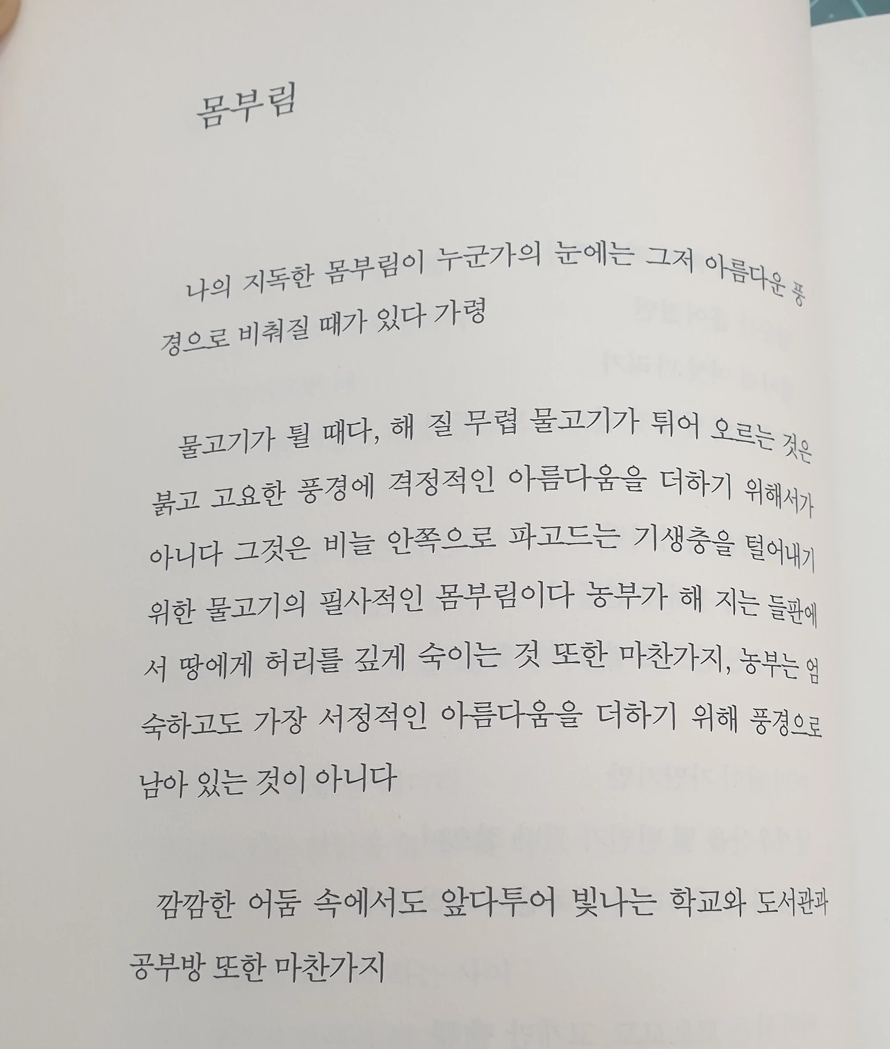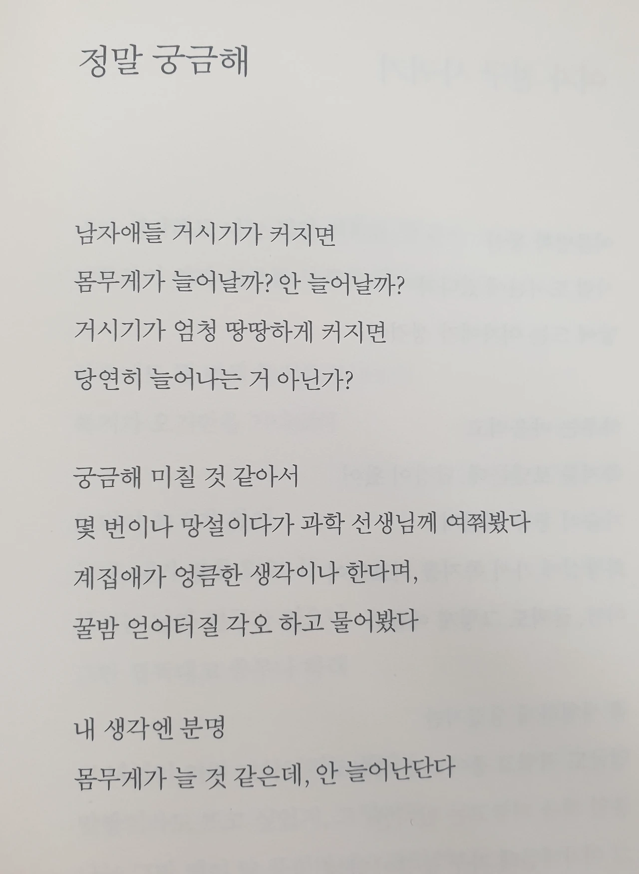 막상 펼쳐서 읽기 시작하자 익숙한 시가 몇 편 보였다. 국어 지도서에 참고시로 소개되어 있기도 한 시였다. 이미 십 년 도 전인 2010년에 나온 시집이었다. 이렇게 뒤늦게 청소년시를 발견하게 된 것은 내 아이가 청소년이 되었기 때문인것은 아닐까. 이렇게 나와 인연을 맺게 된 시집을 아껴가며 한 편씩 읽었다.