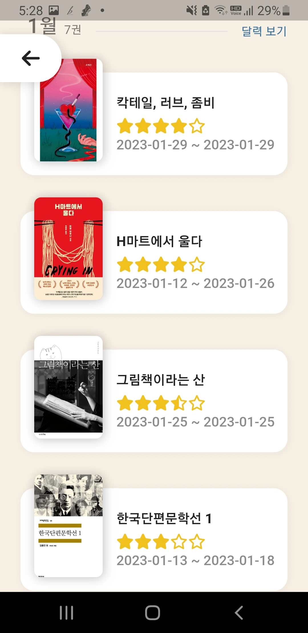 완독하면 별점과 평도 남기는 기능은 당연히 들어있고요. 연 베이지 색 디자인도 깔끔하고 딱 필요한 기능들로만 갖춰져 있어서 피로도도 덜합니다. 독서 기록이 하나씩 쌓이는 재미가 있어서 오래 걸리더라도 꾸준히 읽을 수 있는 동력이 되어줍니다. 써보니 좋아서 독서모임 사람들과 친구들에게 강추했고요, 그렇게 추천받아 써본 사람들도 만족하며 쓰고 있는 앱입니다.