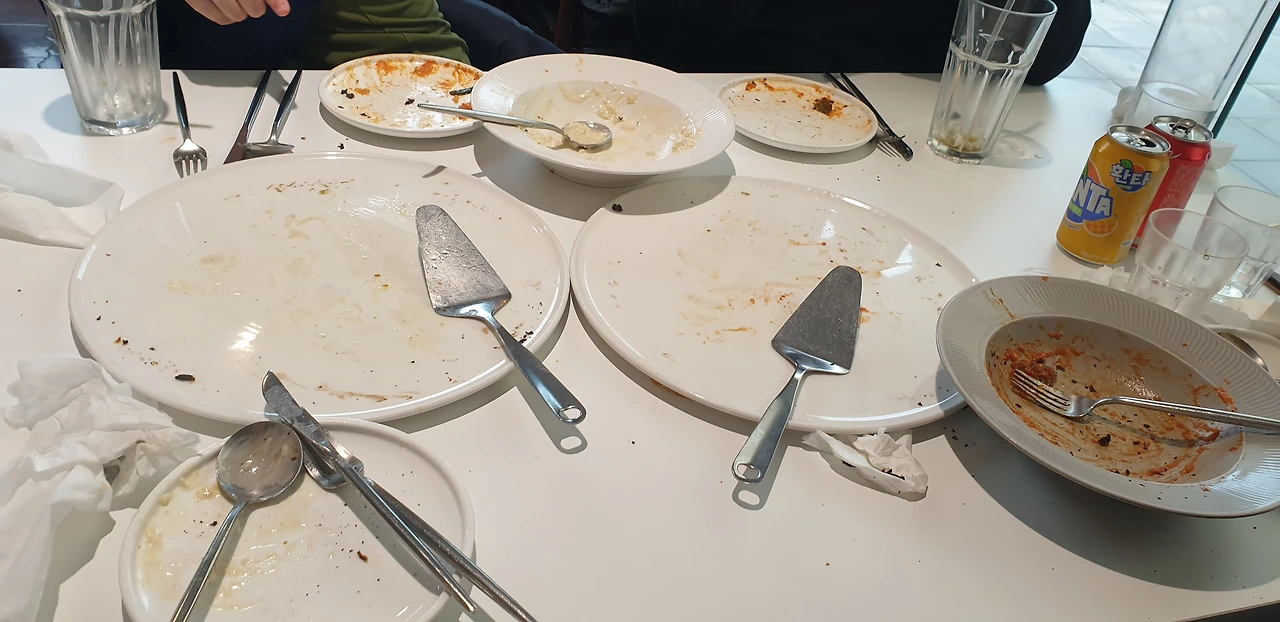 아, 피자 두 판, 파스타, 둘에 샐러드, 음료수 뭐 작은 조각 하나 남기지 않도 다 먹은 사진을 동생에게 보여줬더니 핥아먹었냐고.......;;;