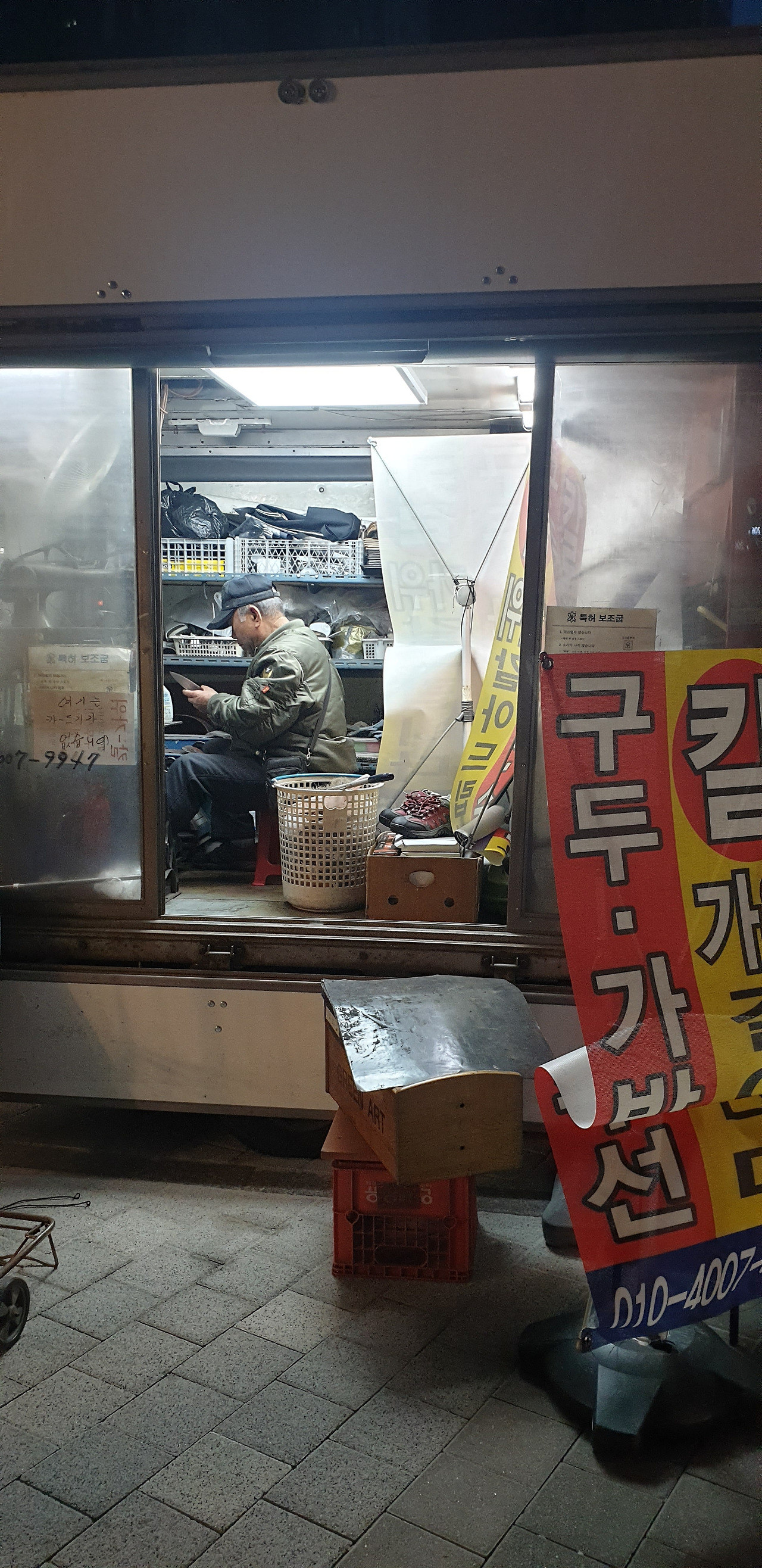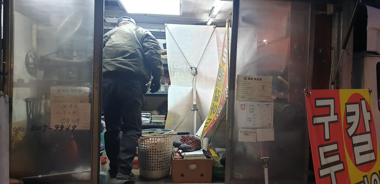 돌아가는 벨트에 칼을 앞뒤로 섬세하게 칼을 가시더니, 마지막으로 칼로 종이를 베어보며 확인하시곤 자신있게 내여주신다. 코팅 부분이 좀 벗겨지긴 했지만 투박한 할아버지 손길을 생각하면 너무 많은 바램이겠거니 싶었다. 조심스레 칼을 받아 값을 치르고 돌아왔다. 뒤돌아보니 전등을 밝히고 열심히 칼을 가시는 할아버지 모습이 진중해보였다. 분명 이 칼은 이전보다 훨씬 잘 들거라는 생각이 들었다.