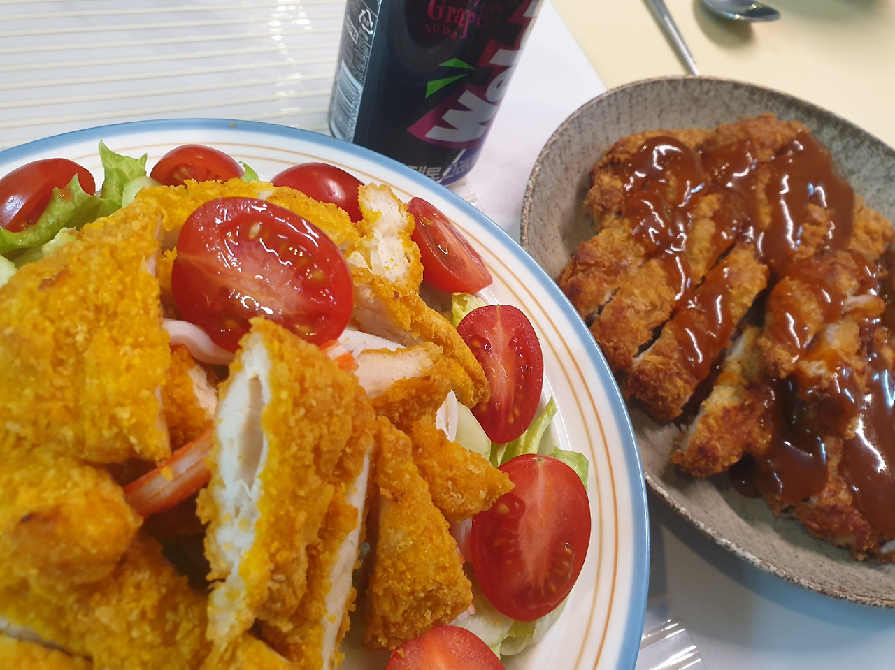 이 정도는 구워줘야 먹을 반찬이 없어 못 먹는다는 소리를 안 듣는다. 돈까스집도 아닌데 여기에 음료수까지 추가한다. 알아서 냉장고에 있던 탄산을 하나 꺼내놓고는 자연스럽게 같이 먹는다. 밥 먹다 음료수라니 나는 상상도 못할 맛이지만, 소맥과 삼겹살 먹는 기분을 생각하면 이해못할 일도 아니다.