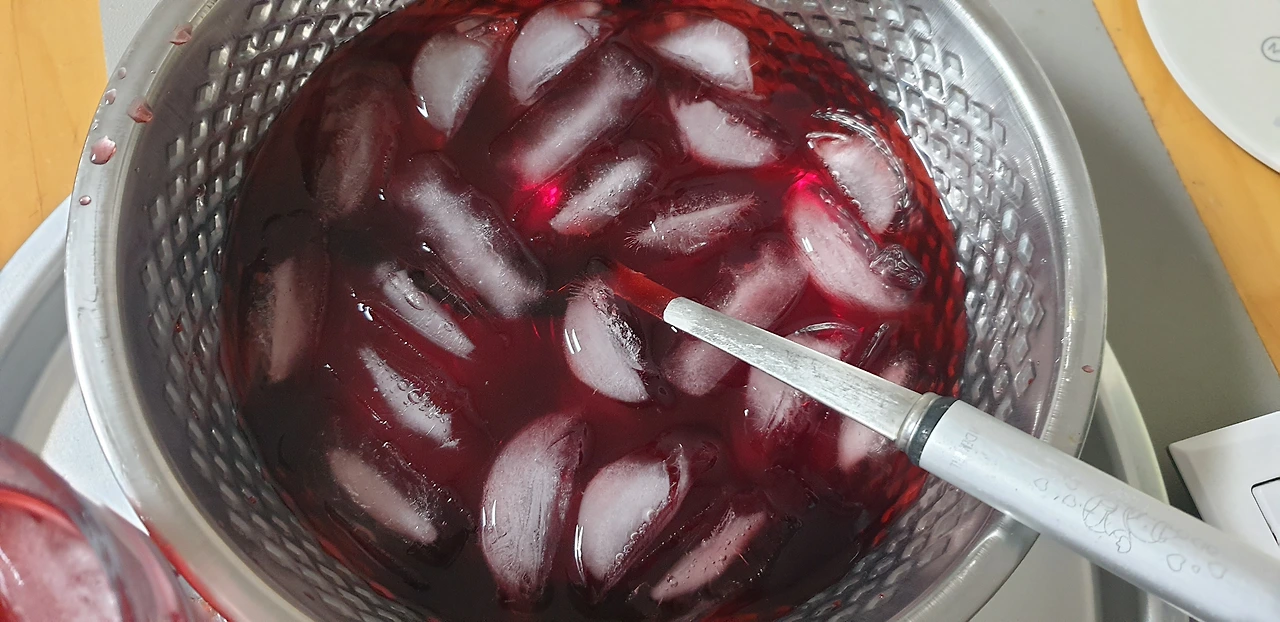 얼음 잔뜩 넣고 스뎅국자로 휘휘 저어준 후아무그릇에나 부어 그냥 마시면 됩니다. 크아~~~~~~ 시원달달해서 쭈욱 들어가죠. 매콤한 맛의 치킨 한 조각 곁들여 대접으로 마시다보면 영롱하고 은은하게 붉은 이것이 내 얼굴 색이냐 술 색이냐 구분을 못하게 됩니다. 일주일째 감기로 몸져누운 남편님 병구완하다 지쳐 기운내려고 만들었습니다.