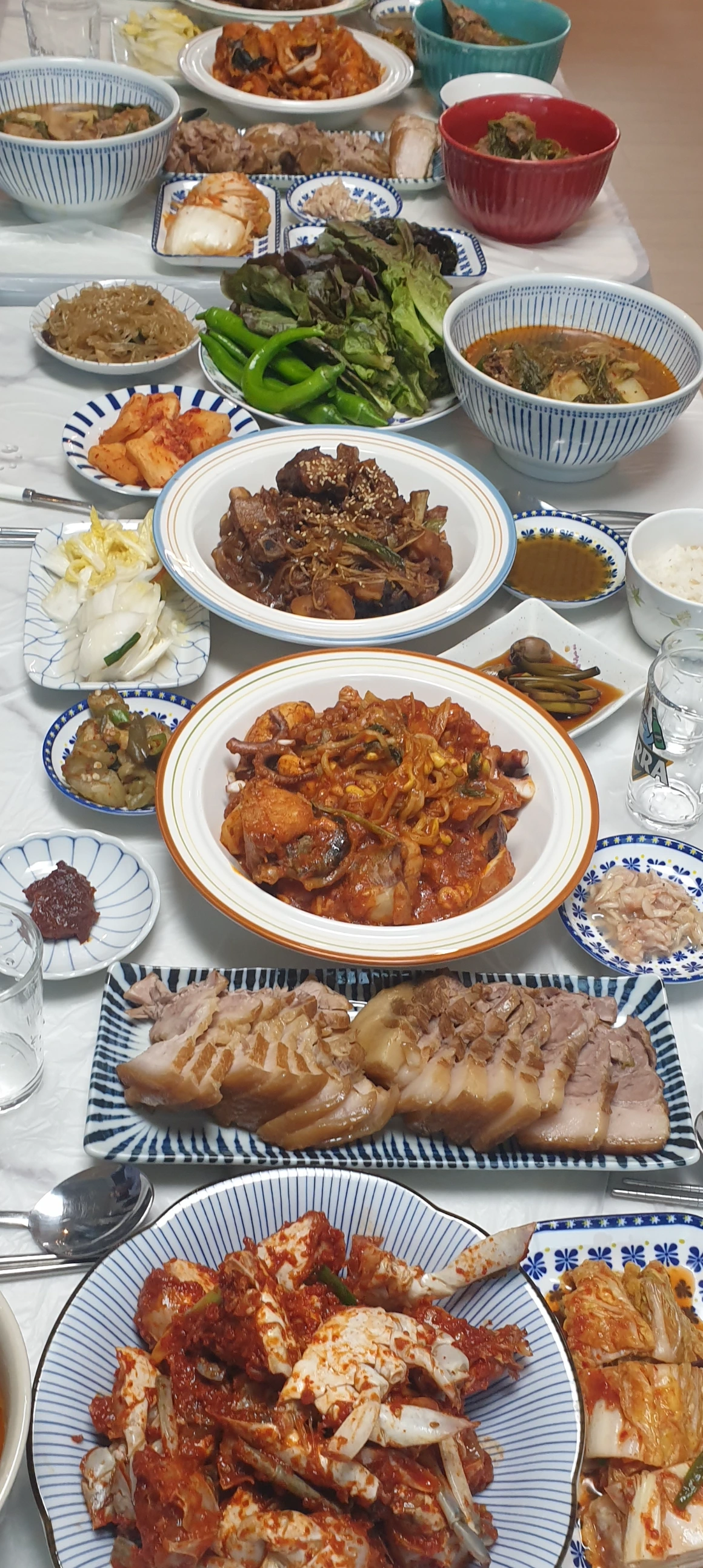 괜찮다고 하는데도 팔순 할매가 김치도 두 종류나 새로 담그고, 꼬들꼬들한 오이지도 무쳐오고, 밥도둑 양념 게장도 한 통가득, 수육도 락앤락 통에 꽉차게 만들어 챙겨오셨다.