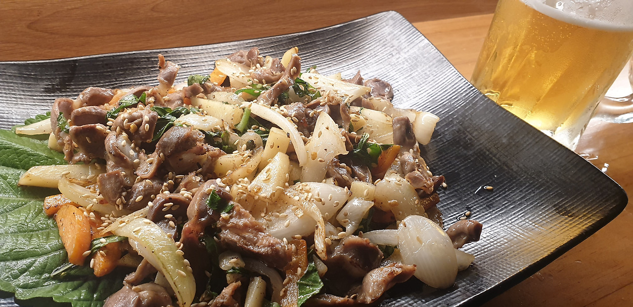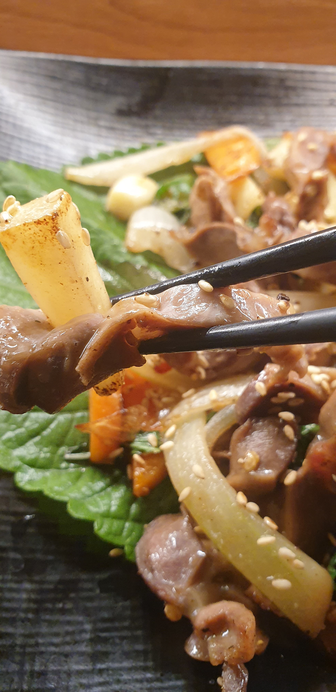 길쭉하게 썰린 당근과 양파, 악센트가 되어주는 뾰족한 고추와 마늘, 그리고 오늘의 주인공, 쫄깃탱글한 똥집. 그 맛을 더욱 살려주는 고소하고 짭짤한 참기름장까지, 완벽한 한 상이 나왔다. 청홍백이 가득한 한 접시에 곁들인 차가운 생맥주! 하루의 마무리로 이보다 더 좋은 게 있을까!