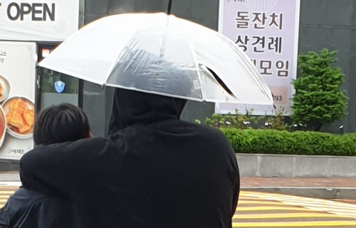 한 지붕 아래 퉁퉁한 두 어깨가 비좁다. 서로 바깥쪽 어깨는 비에 내주고 반쪽씩만 우산으로 가리고 걸었다.