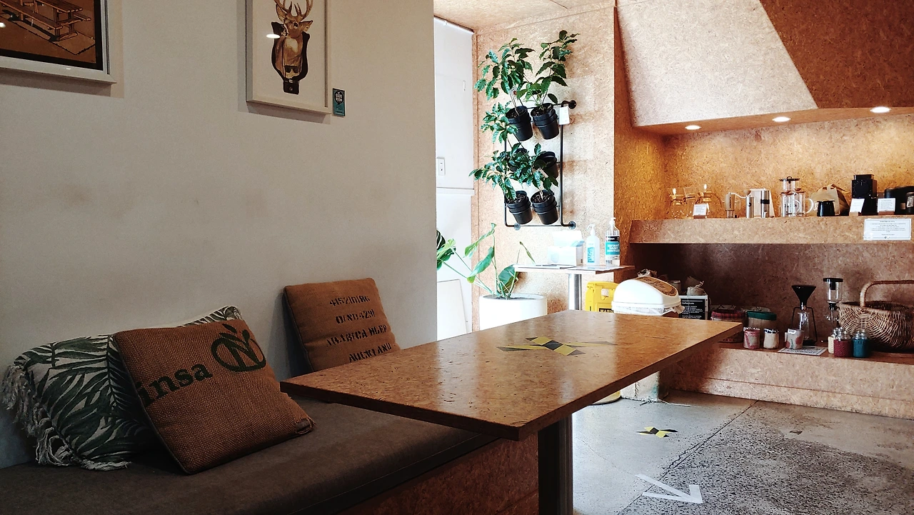 모퉁이를 돌아 들어서니 표지판처럼 작은 카페가 보였다. 건물 앞에는 카페를 알리는 간판 여러 개가 진열되어 작은 카페의 존재감을 크게 만들었다. 바깥에는 야외 테이블이 단 두 개 밖에 없지만, 큰 테이블을 사이에 두고 손님들은 보이지 않는 질서를 지키며 각자의 시간을 여유롭게 보내도록 했다. 외부는 가게 문을 닫을 때 사용하는 셔터같이 생긴 철제의 인테리어로 자칫 폐쇄적인 이미지를 줄 뻔했지만, 회색빛과 대조되는 작은 간판들과 화분들이 그 느낌을 배제시켜준다. 월요일부터 토요일까지 문을 여는데 평일엔 네 시까지, 토요일엔 두 시까지 하는 걸 보아 주변 상권의 영향으로 다른 카페들보다 비교적 문을 늦게 닫는 듯하다.