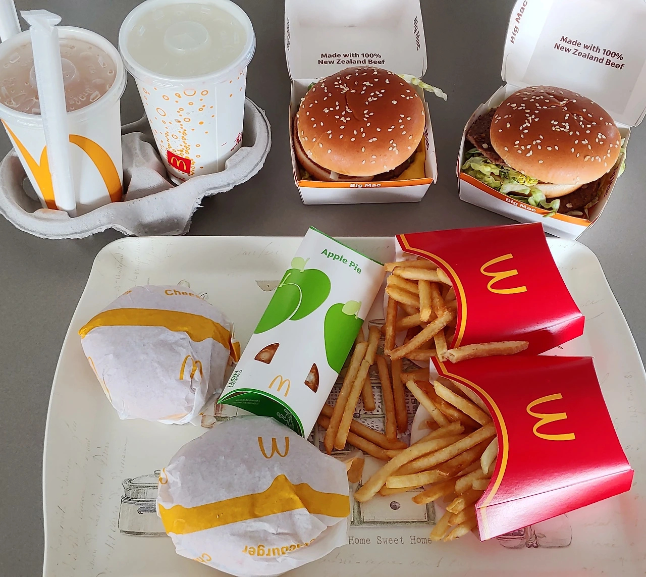 우리가 주문한 2인 세트 메뉴의 구성은 ‘빅맥 두 개+치즈버거 두 개+감자튀김 두 개+탄산음료 두 잔’이었다. 2인 세트인데 햄버거를 4개나 주다니 관대한 서비스에 크게 감동했다. 거기에 뉴질랜드에서 얼굴만 알고 지낸 친구가 매일 먹길래 궁금했던 ‘애플파이’도 사왔다. 새우버거가 아니면 거들떠보지 않았지만 뉴질랜드에서의 맥도날드 인기를 실감해보기 위한 첫 시식이었다. 삼 주 만에 맡아보는 바깥 음식 냄새에 들뜬 마음을 주체하기 어려워졌다. 햄버거를 두 개나 먹을 생각이 더해져서 신났던 것도 분명하다. 기대한 마음이 작아지기까지는 금방이었다.