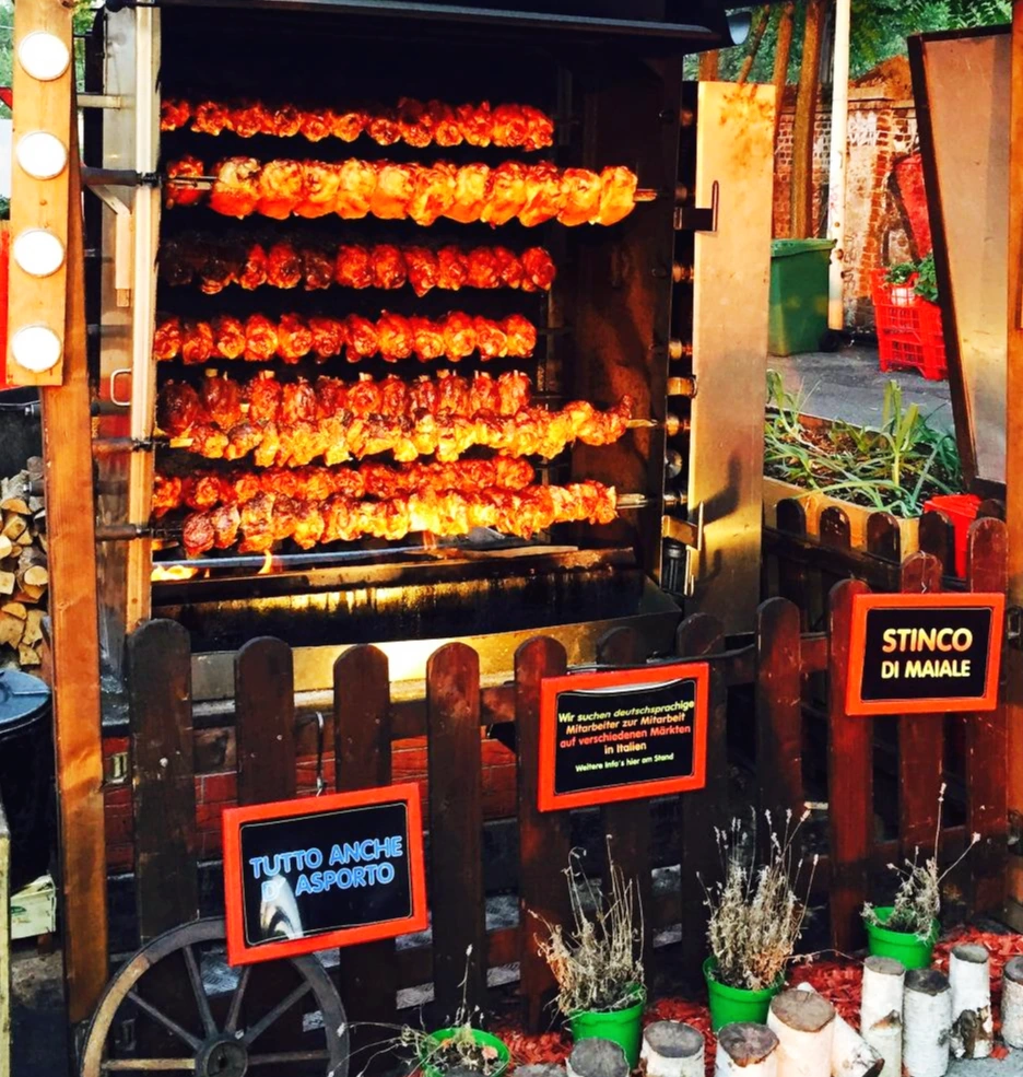 날이 뜨겁고 손에 묻히고 싶지 않아서 이 날은 피했지만 이 날 저녁 야외에서 사실 가장 인기가 많아 보이는 이 왼쪽 요리였어요. 독일식 돼지 다리 구이인데 간단하게 돼지정강이Stinco di Maiale라고 적혀 있네요. 적당히 양념을 해서 전기통닭 굽듯 빙글빙글 돌려가며 굽는데 정말 군침돌게 만드는 빛깔이었어요. 동시에 이 부스에서 일하는 분들이 참 힘들겠다는 생각도 들었고요.