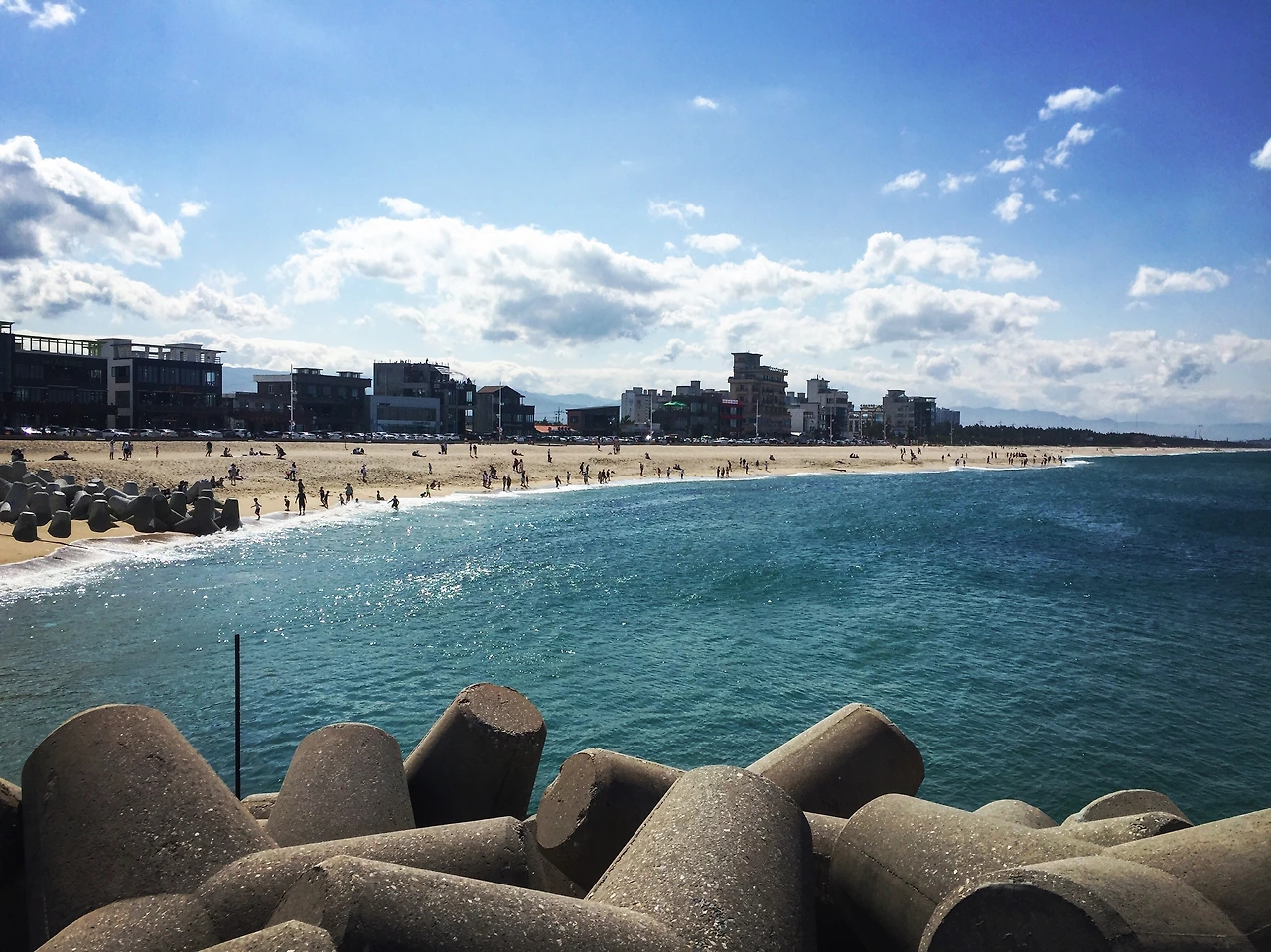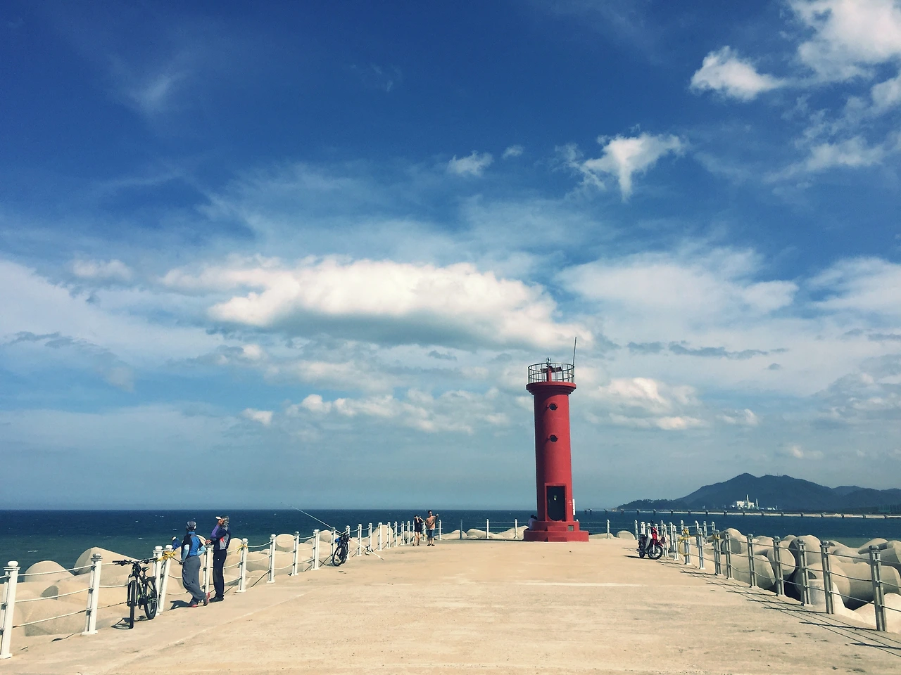 강릉항을 둘러싸고 있는 방파제를 따라 걸으면서 바라본 안목해변의 모습입니다. 개장이 아직 일주일 남은 시점이었지만 벌써 해수욕을 하러 온 사람들이 꽤 많았습니다. 위험해 보이지만 방파제 위에서 낚시를 하는 아저씨들도 많았어요. 낚시의 재미를 모르는 나에게는 오매불망 기다리기만 하고 있는 것 같은데 대체 어느 구석이 재미있는걸까 싶었습니다. 그 재미를 이번 생에 알게 될 것 같지도 않지만, 또 사람 일은 모르는 법이겠지요. 대여섯 명 친구들끼리 모여 일찍 휴가를 온 대학생들의 부탁으로 사진을 찍어 주기도 했습니다. 참 예쁘게도 하고 온 학생들이 많았어요. 그 풍경의 일부가 된다는 생각만으로도 기분이 좋아지는 바닷가 산책이었습니다.