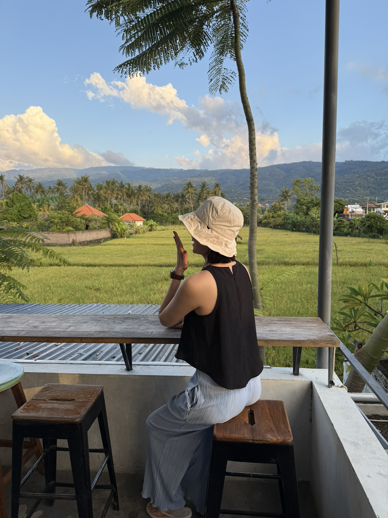오후에 느지막이 일어나 브런치를 먹으러 근처 카페에 갔다. 우리가 고른 메뉴는 치킨버섯샌드위치와 아보카도가 듬뿍 들어간 빵, 그리고 길리 커피. 숙소에서 불과 350미터 떨어진 곳이었지만, 가는 길이 꽤나 험난했다. ‘Taxi! Taxi!’를 외치며 달려드는 호객꾼들 사이를 지나야 했고, 뜨거운 날씨까지 더해져 금세 진이 빠졌다. 하지만 2층에 올라가 풍경을 마주하자, ‘아, 여기가 발리지’ 하는 실감이 났다. 열대의 햇살 아래 펼쳐진 이국적인 거리와 바람, 그리고 커피 한 잔이 주는 여유가 드디어 여행이 시작됐다는 걸 알려주었다.