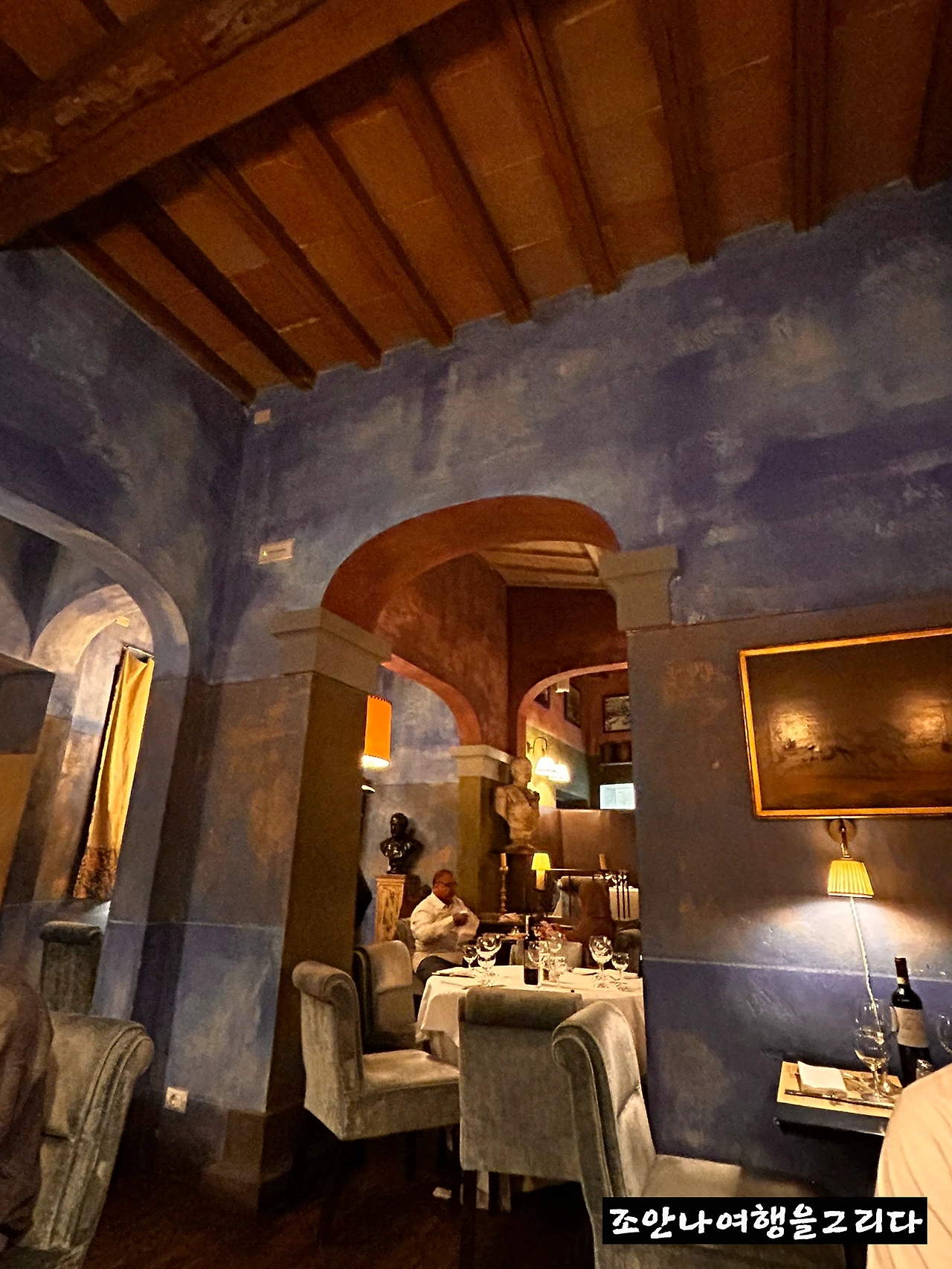 트라토리아 자자에서의 저녁 만찬. 다행히 저녁 6시 30분 예약 시간에는 늦지 않게 도착할 수 있었다. 저녁을 먹기엔 아직 이른 시간이었지만 외부 테라스에는 벌써 여러 테이블에 사람들이 앉아 있다. 우리는 미켈란젤로 언덕에서 너무 오들오들 떨어 선호도가 높은 외부 테라스 대신 따뜻한 실내를 선택한다. 실내는 넓은 공간이었음에도 불구하고 옛날 주택의 내부를 그대로 살린 아치형 인테리어 구조로 가정집 같은 아늑함이 느껴진다. 거기에 나뉜 공간마다 벽 컬러를 다르게 사용하며 빈티지한 분위기를 더한다. 특히 우리가 안내받은 곳은 통나무로 된 천장에 빈티지한 딥블루 컬러의 벽, 은은한 조명이 어우러지며 내 취향을 저격했다. 따뜻한 온기와 은은하게 나는 숯불고기향을 맡자 우리는 언제 마음이 불편했냐는 듯 얼었던 몸과 함께 불편한 마음도 스르륵 녹기 시작한다.